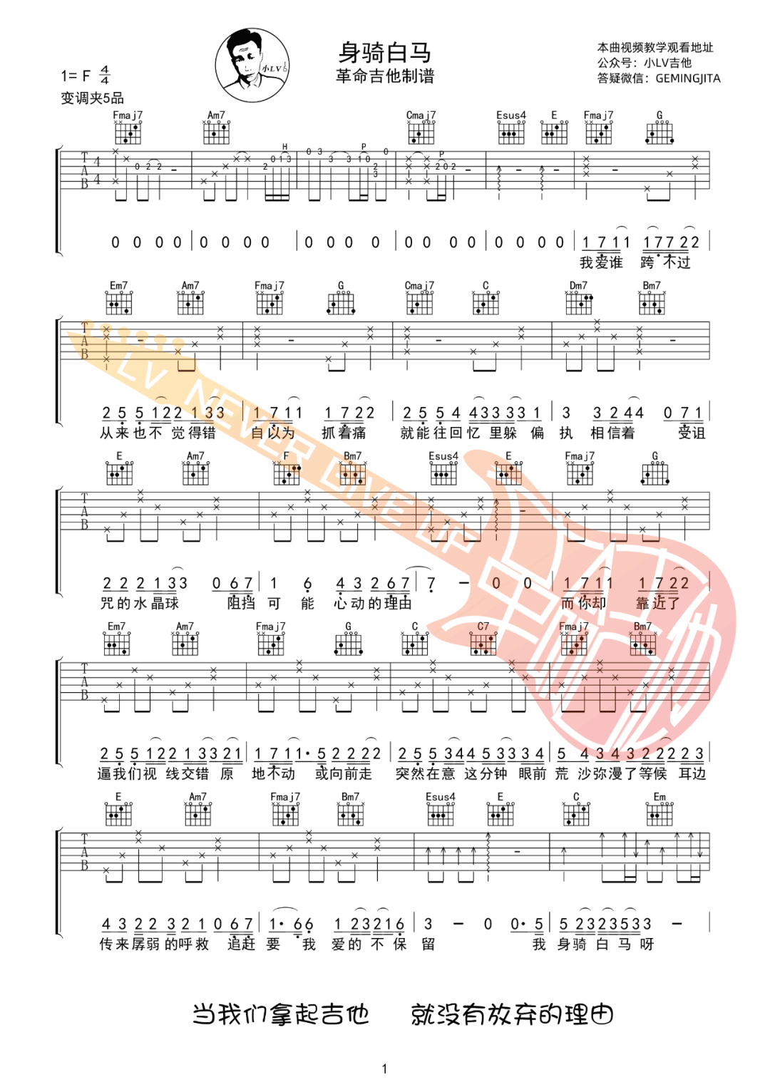 《徐佳莹《身骑白马吉他谱》(G调)》内容来自于互联网,不能保证内容的准确性与完整性,仅供学习交流欣赏,请勿用于其它用途,内容版权归原作者及来源网站所有,如有侵犯到您的权益请来信告知,我们将及时删除。