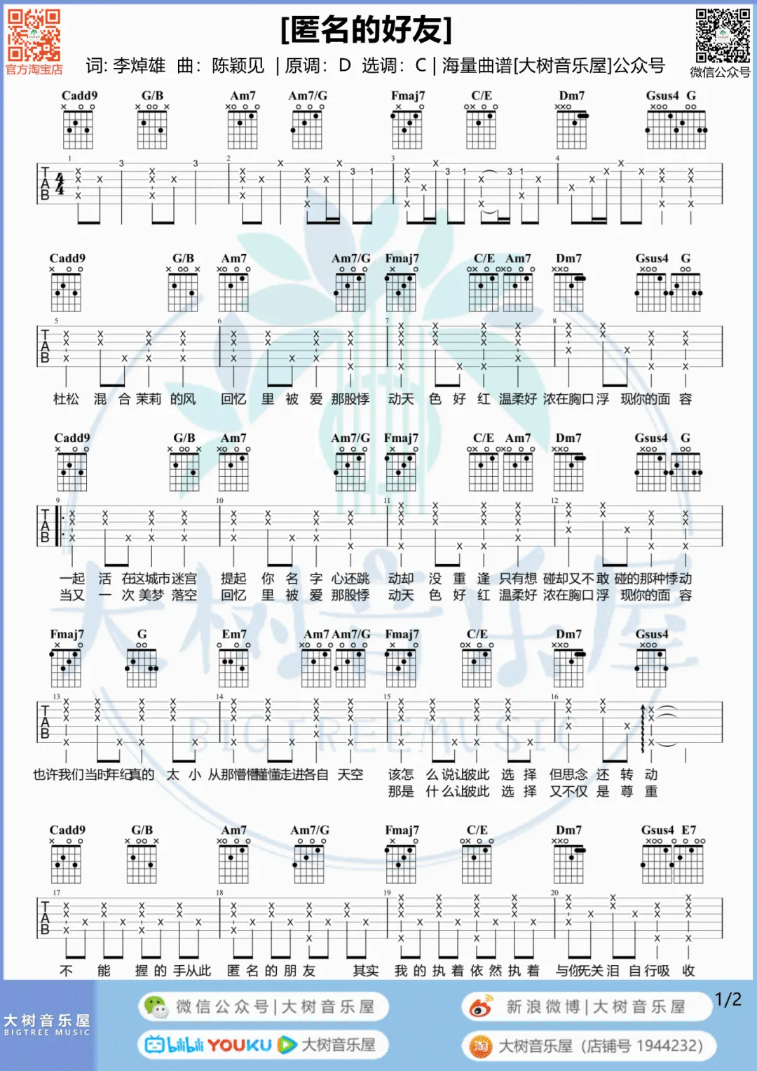 《杨丞琳《匿名的好友吉他谱》(C调)》内容来自于互联网,不能保证内容的准确性与完整性,仅供学习交流欣赏,请勿用于其它用途,内容版权归原作者及来源网站所有,如有侵犯到您的权益请来信告知,我们将及时删除。