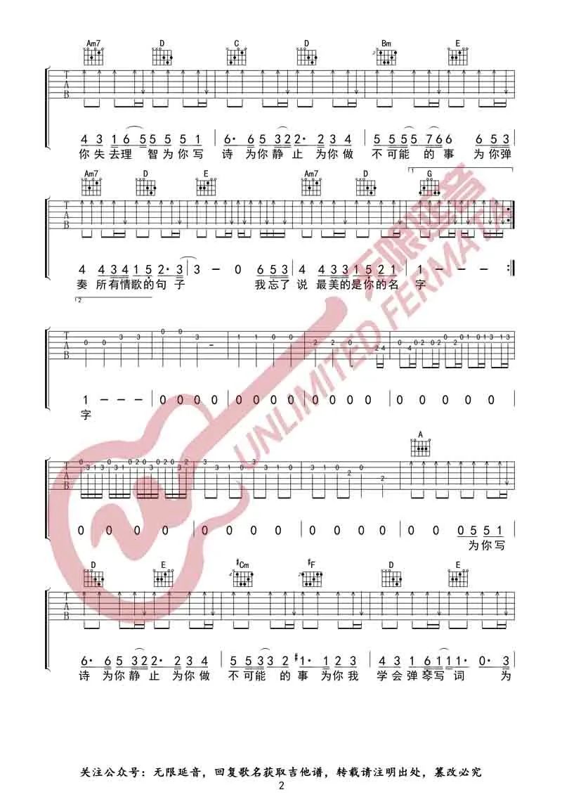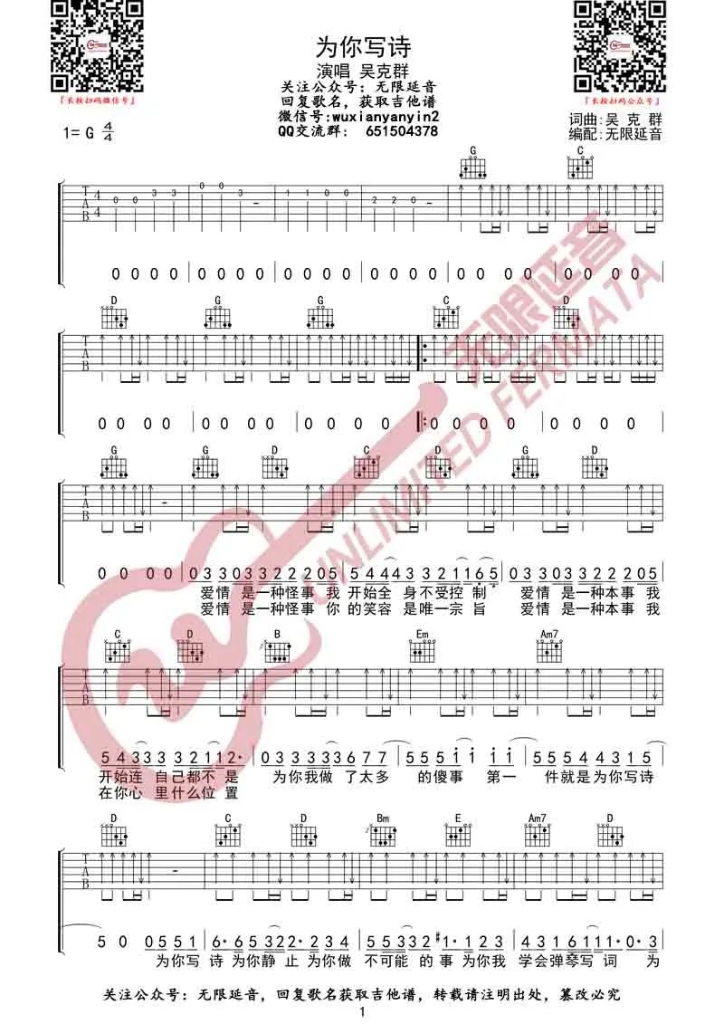 《吴克群《为你写诗吉他谱》(G调)》内容来自于互联网,不能保证内容的准确性与完整性,仅供学习交流欣赏,请勿用于其它用途,内容版权归原作者及来源网站所有,如有侵犯到您的权益请来信告知,我们将及时删除。