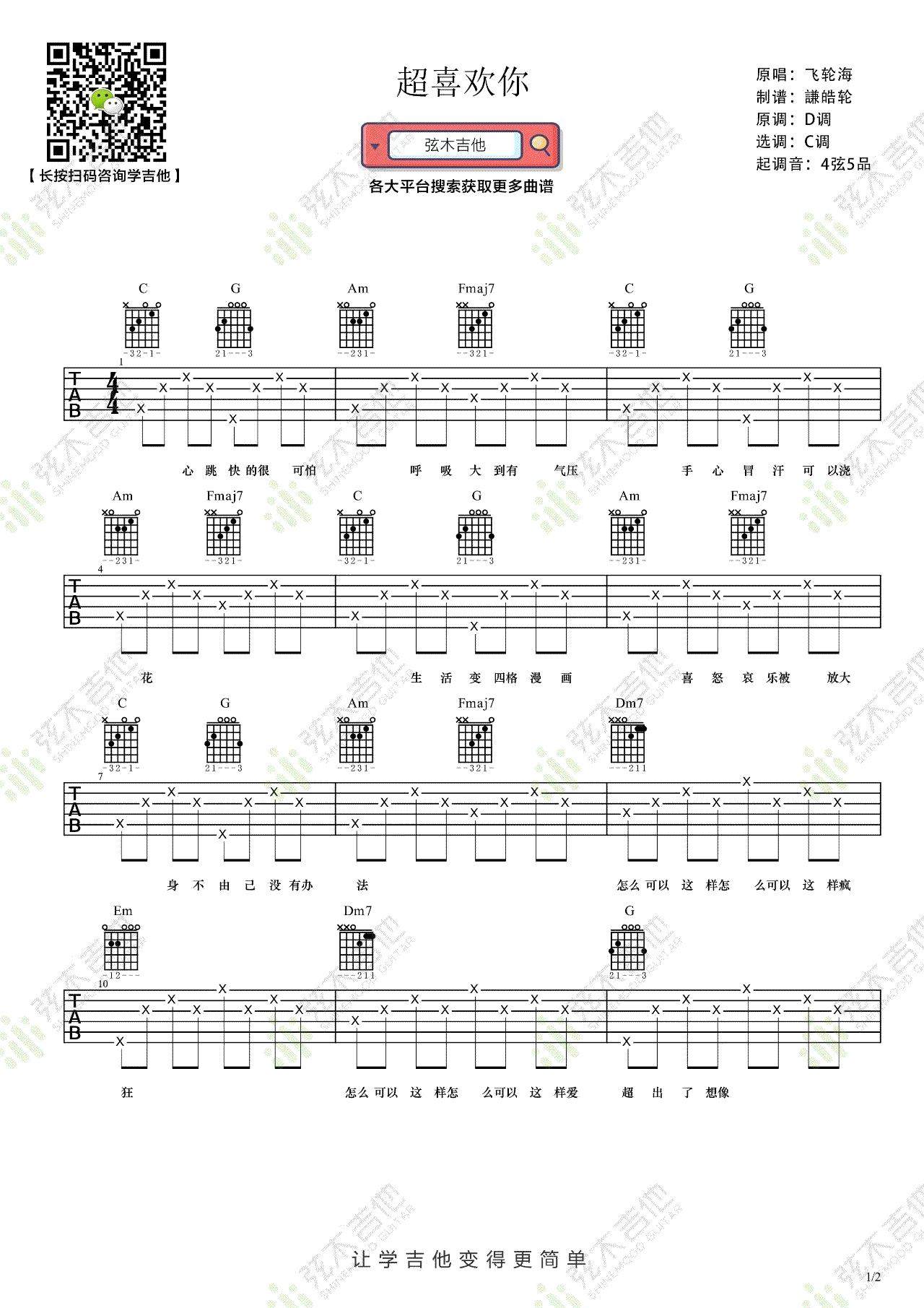 《飞轮海《超喜欢你吉他谱》(C调)》内容来自于互联网,不能保证内容的准确性与完整性,仅供学习交流欣赏,请勿用于其它用途,内容版权归原作者及来源网站所有,如有侵犯到您的权益请来信告知,我们将及时删除。