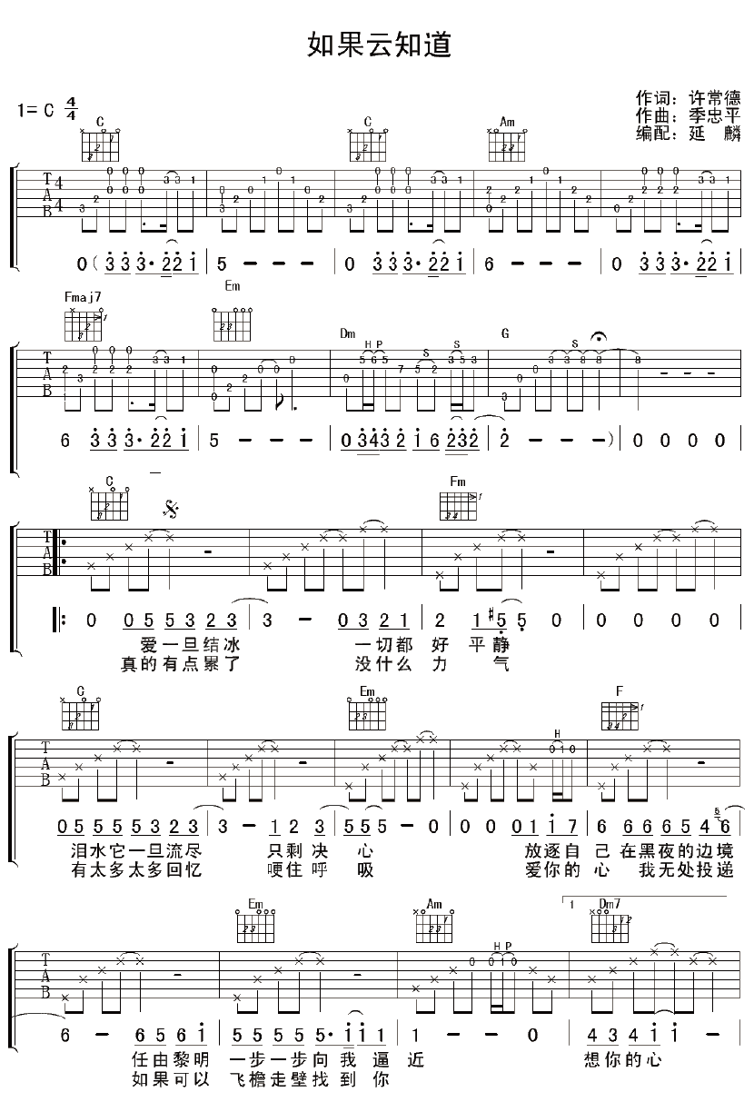 《齐秦《如果云知道吉他谱》(C调)》内容来自于互联网,不能保证内容的准确性与完整性,仅供学习交流欣赏,请勿用于其它用途,内容版权归原作者及来源网站所有,如有侵犯到您的权益请来信告知,我们将及时删除。