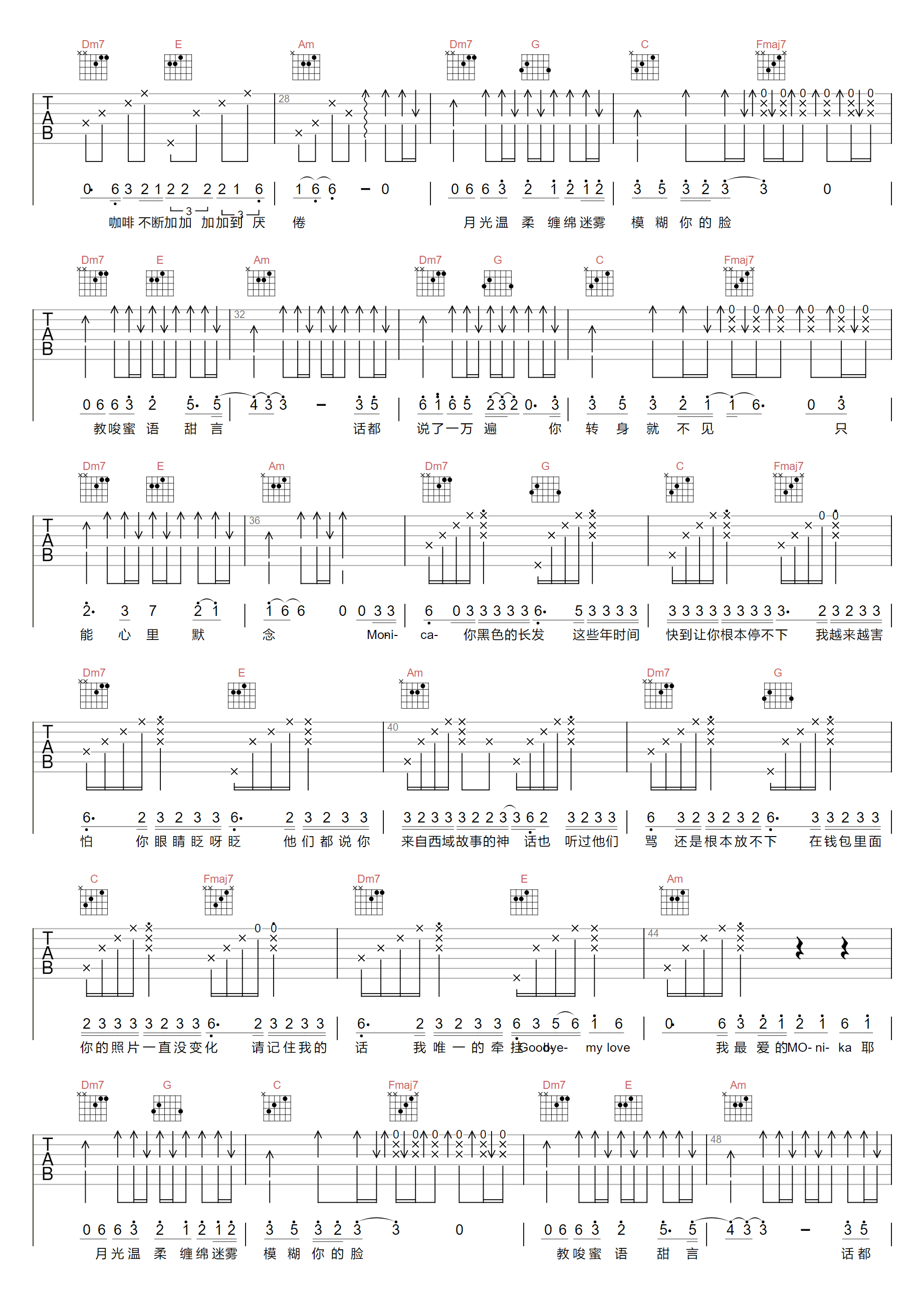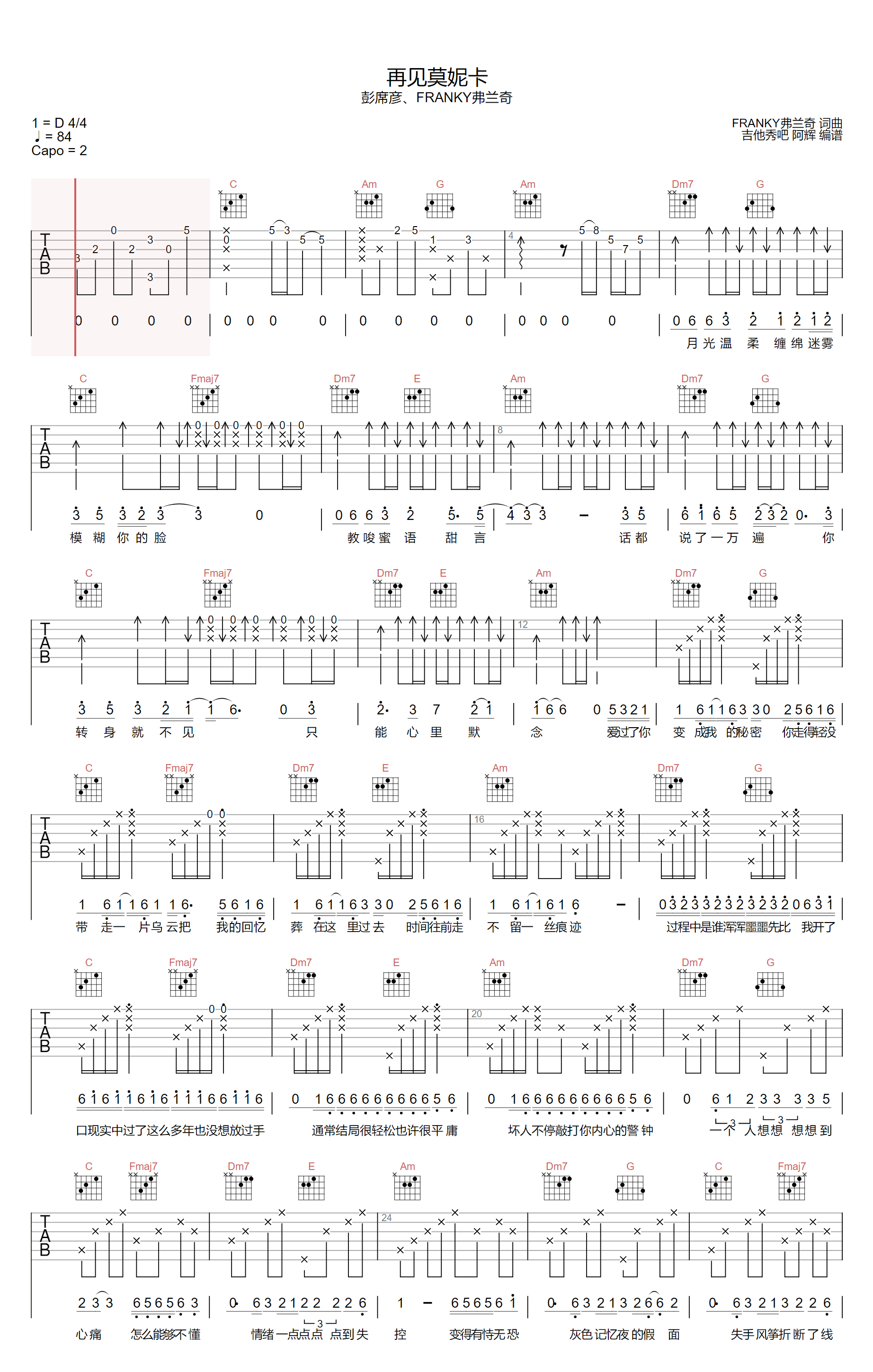 《彭席彦/Franky弗兰奇《再见莫妮卡吉他谱》(C调)》内容来自于互联网,不能保证内容的准确性与完整性,仅供学习交流欣赏,请勿用于其它用途,内容版权归原作者及来源网站所有,如有侵犯到您的权益请来信告知,我们将及时删除。