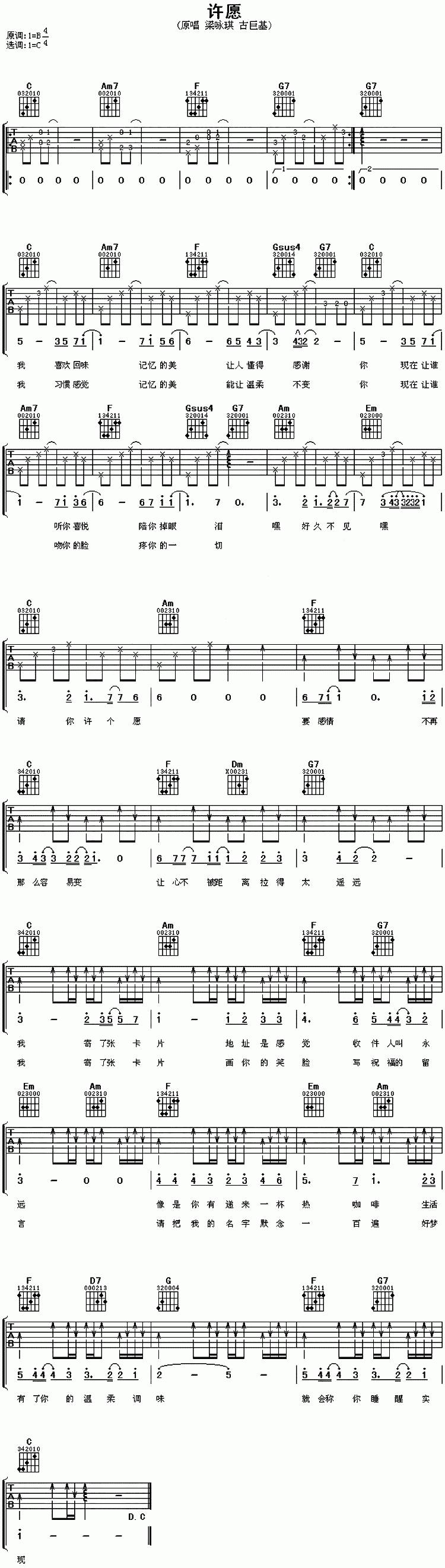 《梁咏琪/王大陆《许愿吉他谱》(C调)》内容来自于互联网,不能保证内容的准确性与完整性,仅供学习交流欣赏,请勿用于其它用途,内容版权归原作者及来源网站所有,如有侵犯到您的权益请来信告知,我们将及时删除。