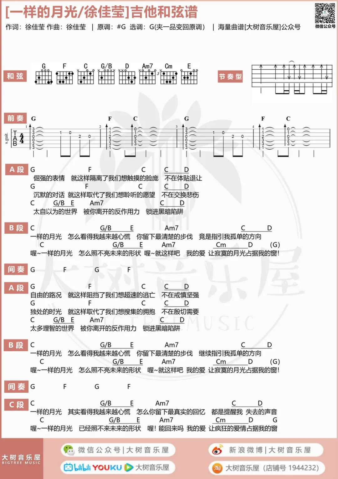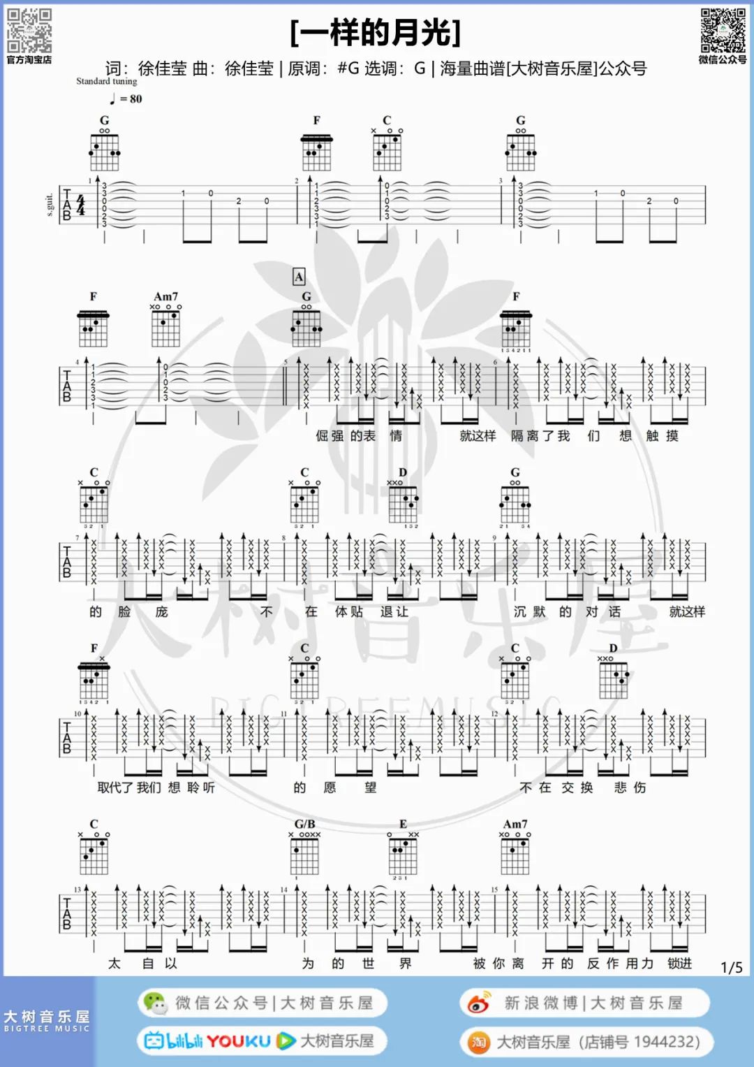 《徐佳莹《一样的月光吉他谱》(G调)》内容来自于互联网,不能保证内容的准确性与完整性,仅供学习交流欣赏,请勿用于其它用途,内容版权归原作者及来源网站所有,如有侵犯到您的权益请来信告知,我们将及时删除。