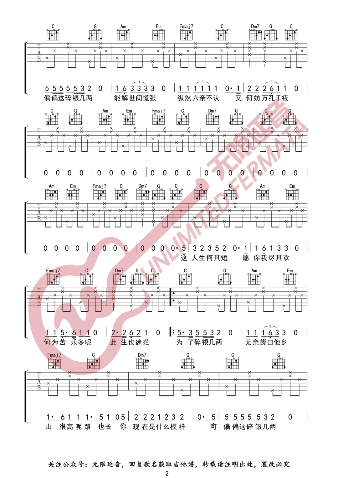 《轩东《碎银几两吉他谱》(C调)》内容来自于互联网,不能保证内容的准确性与完整性,仅供学习交流欣赏,请勿用于其它用途,内容版权归原作者及来源网站所有,如有侵犯到您的权益请来信告知,我们将及时删除。
