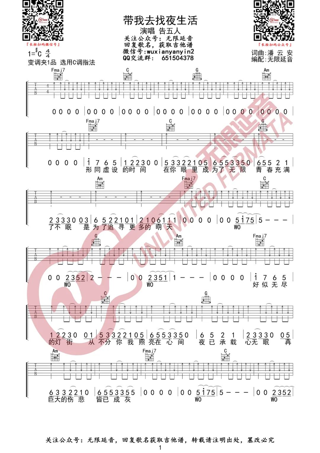 《告五人《带我去找夜生活吉他谱》(E调)》内容来自于互联网,不能保证内容的准确性与完整性,仅供学习交流欣赏,请勿用于其它用途,内容版权归原作者及来源网站所有,如有侵犯到您的权益请来信告知,我们将及时删除。