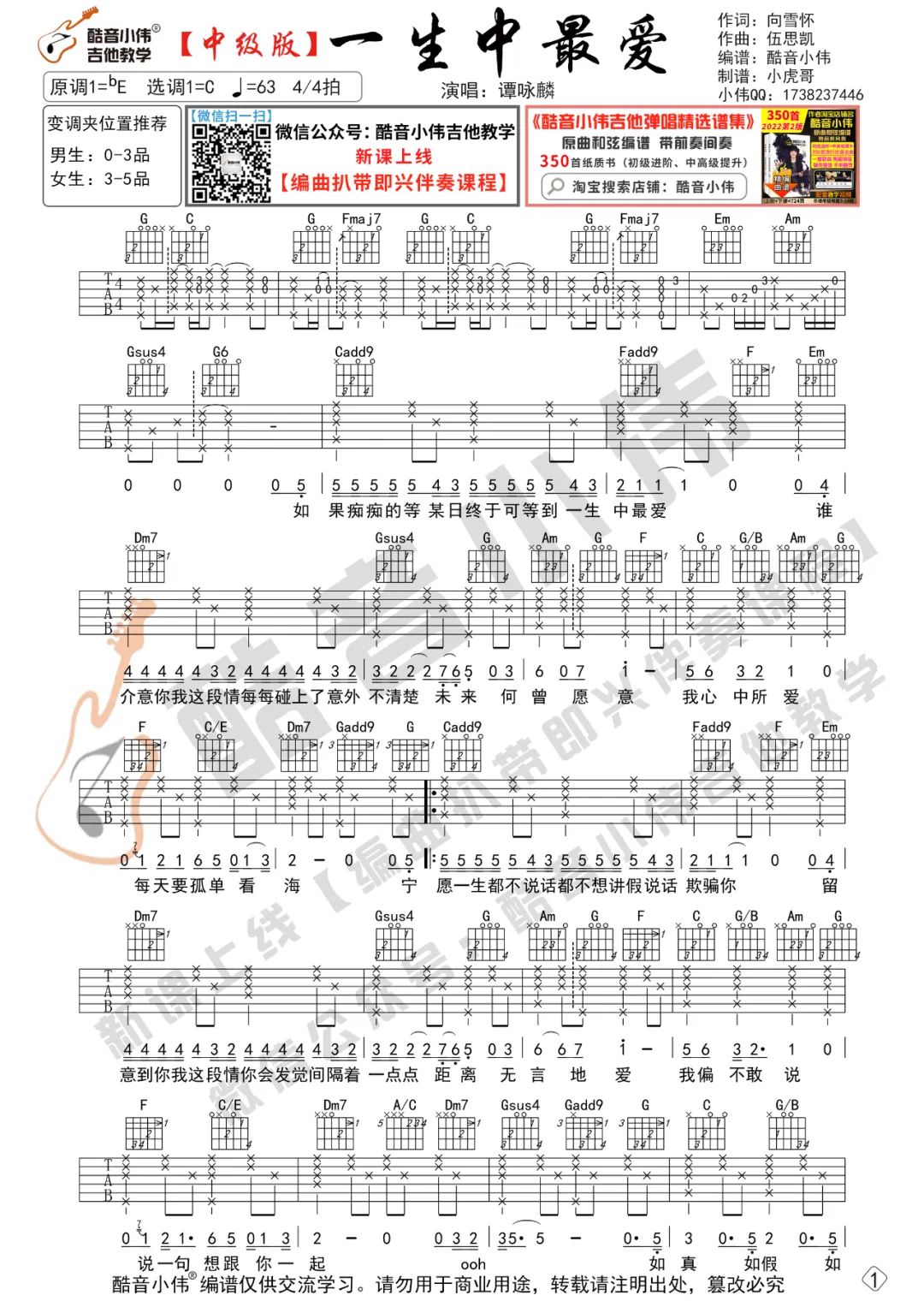 《谭咏麟《一生中最爱吉他谱》(G调)》内容来自于互联网,不能保证内容的准确性与完整性,仅供学习交流欣赏,请勿用于其它用途,内容版权归原作者及来源网站所有,如有侵犯到您的权益请来信告知,我们将及时删除。