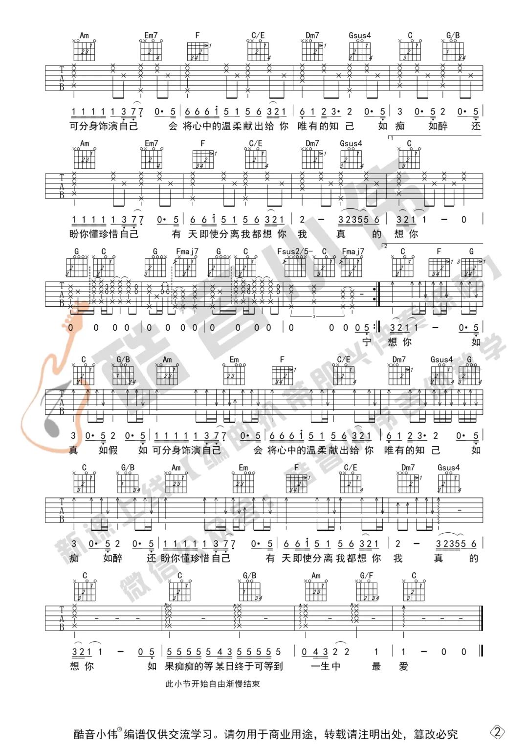 想某人白嘉峻演唱G调,想某人吉他弹唱谱,变调夹夹第一品。和弦分析:首先说说比较简单的,把三和弦丰富一下,一级用了add9;二级、三级、六级用了小七;四级用了maj7;五级用了sus4。这首歌的副歌基本上是一个很常用且经典的卡农走向,其中用了很多斜杠和弦使得低音