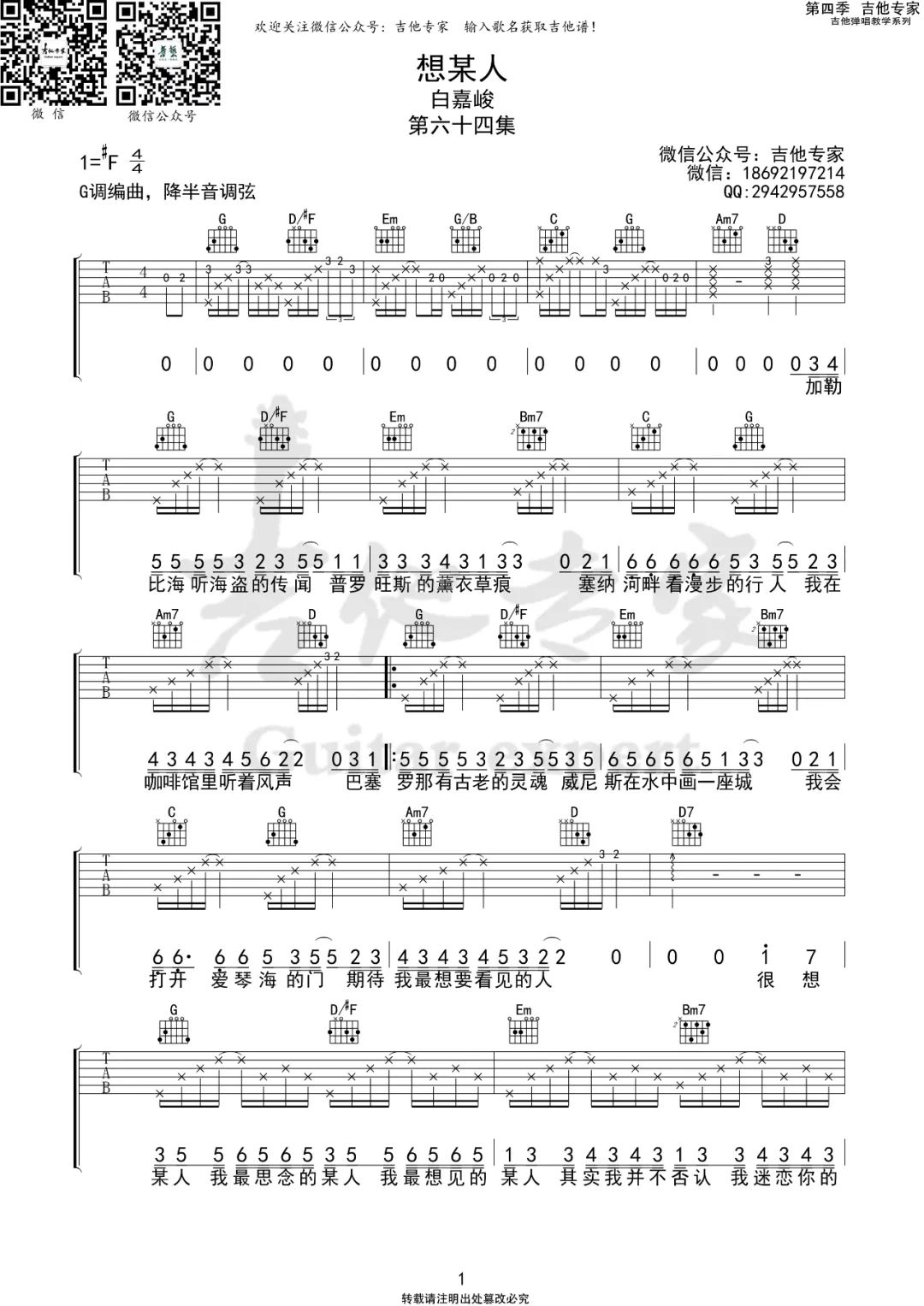 《白嘉峻《想某人吉他谱》(G调)》内容来自于互联网,不能保证内容的准确性与完整性,仅供学习交流欣赏,请勿用于其它用途,内容版权归原作者及来源网站所有,如有侵犯到您的权益请来信告知,我们将及时删除。