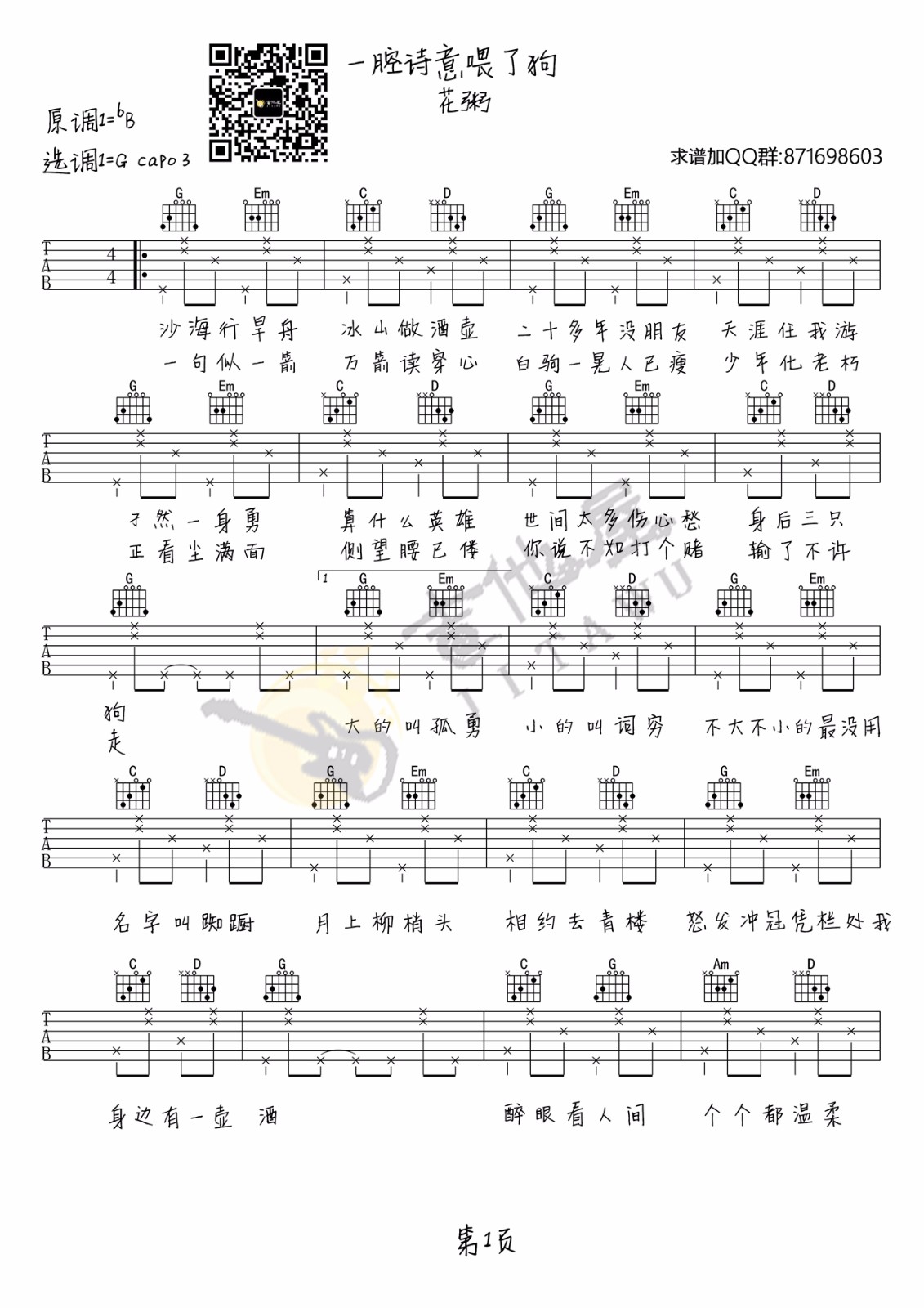 《花粥《一腔诗意喂了狗吉他谱》(G调)》内容来自于互联网,不能保证内容的准确性与完整性,仅供学习交流欣赏,请勿用于其它用途,内容版权归原作者及来源网站所有,如有侵犯到您的权益请来信告知,我们将及时删除。