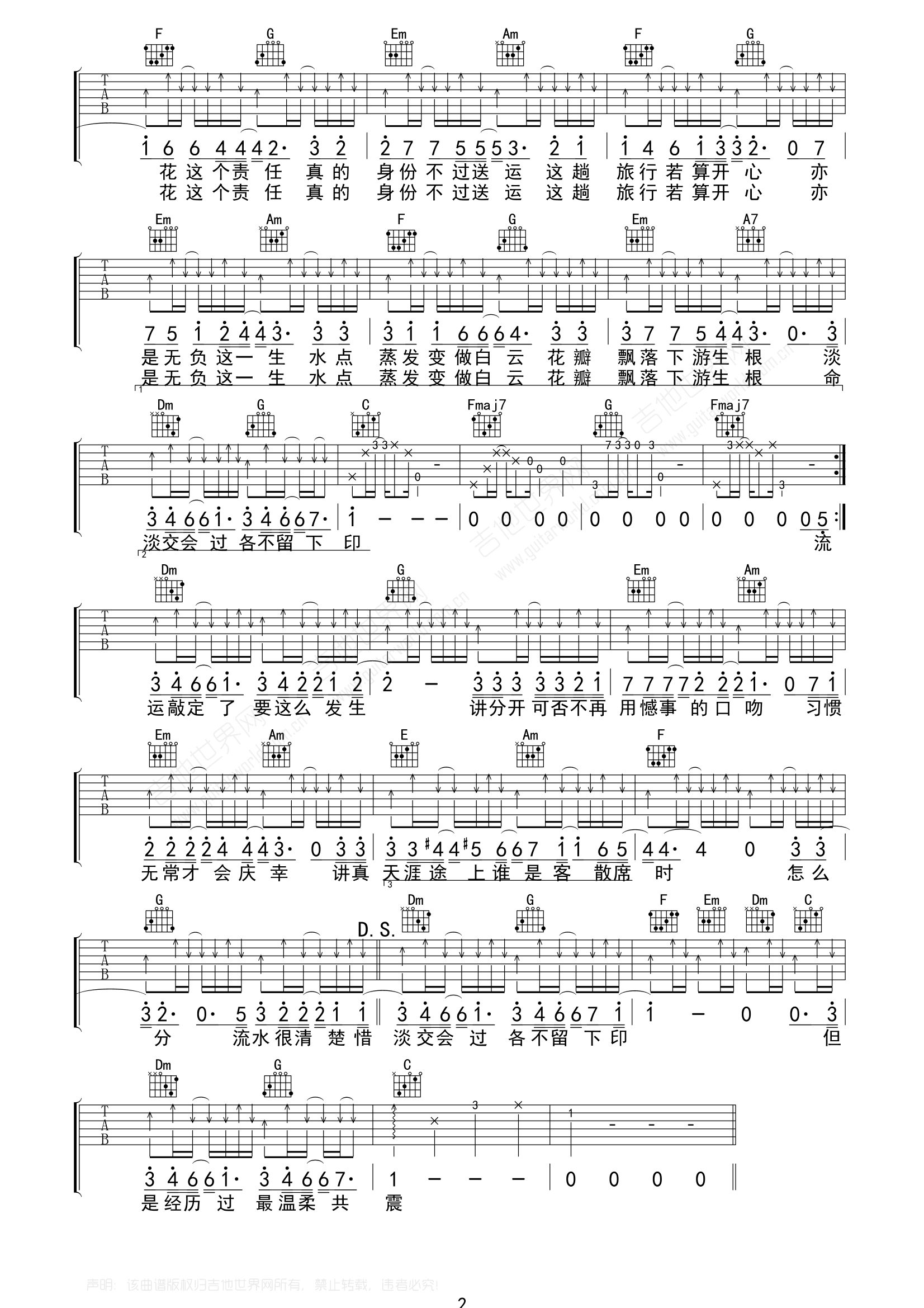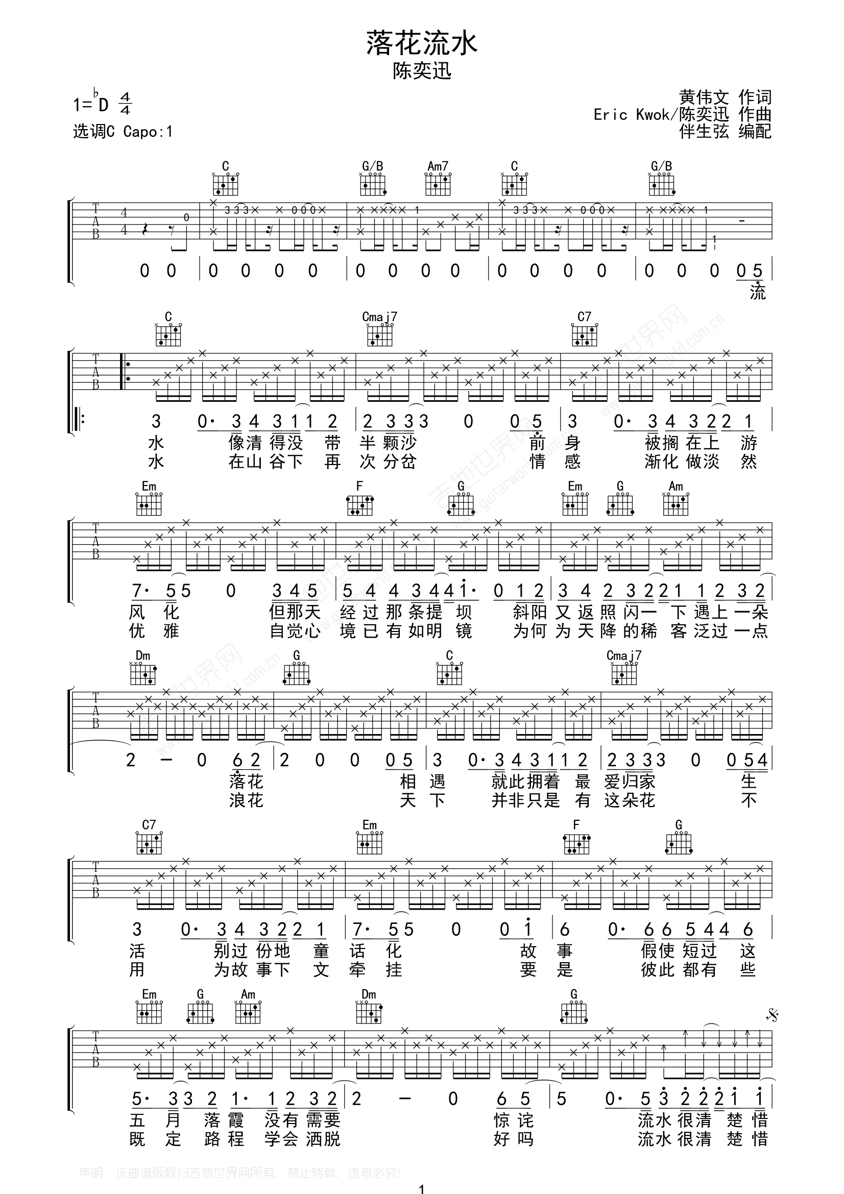 《陈奕迅《落花流水吉他谱》(C调)》内容来自于互联网,不能保证内容的准确性与完整性,仅供学习交流欣赏,请勿用于其它用途,内容版权归原作者及来源网站所有,如有侵犯到您的权益请来信告知,我们将及时删除。