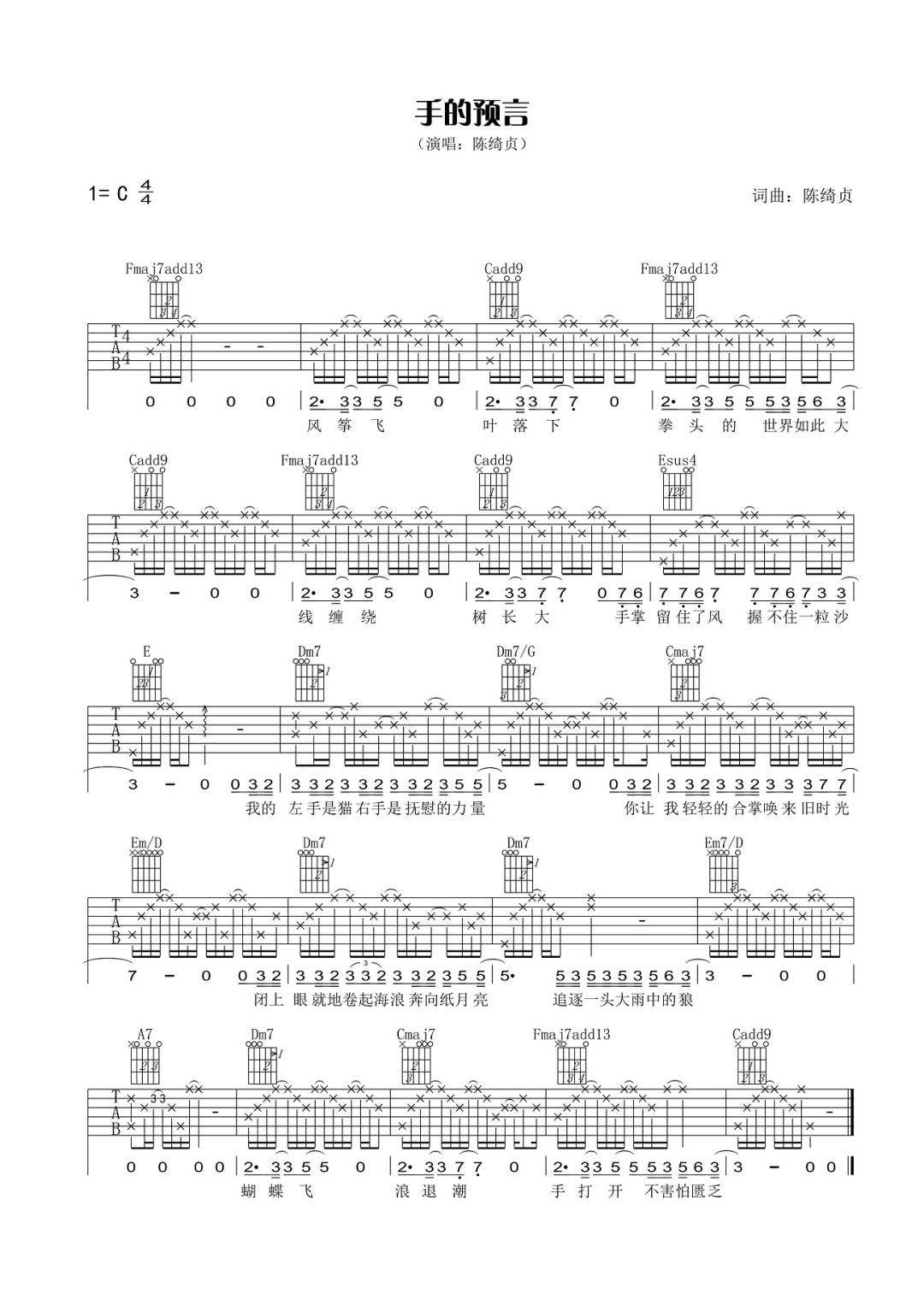 《陈绮贞《手的预言吉他谱》(C调)》内容来自于互联网,不能保证内容的准确性与完整性,仅供学习交流欣赏,请勿用于其它用途,内容版权归原作者及来源网站所有,如有侵犯到您的权益请来信告知,我们将及时删除。