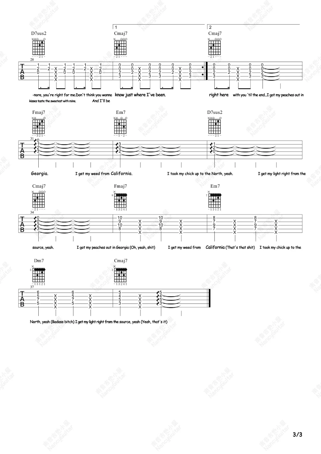 《Justin Bieber《Peaches吉他谱》(C调)》内容来自于互联网,不能保证内容的准确性与完整性,仅供学习交流欣赏,请勿用于其它用途,内容版权归原作者及来源网站所有,如有侵犯到您的权益请来信告知,我们将及时删除。