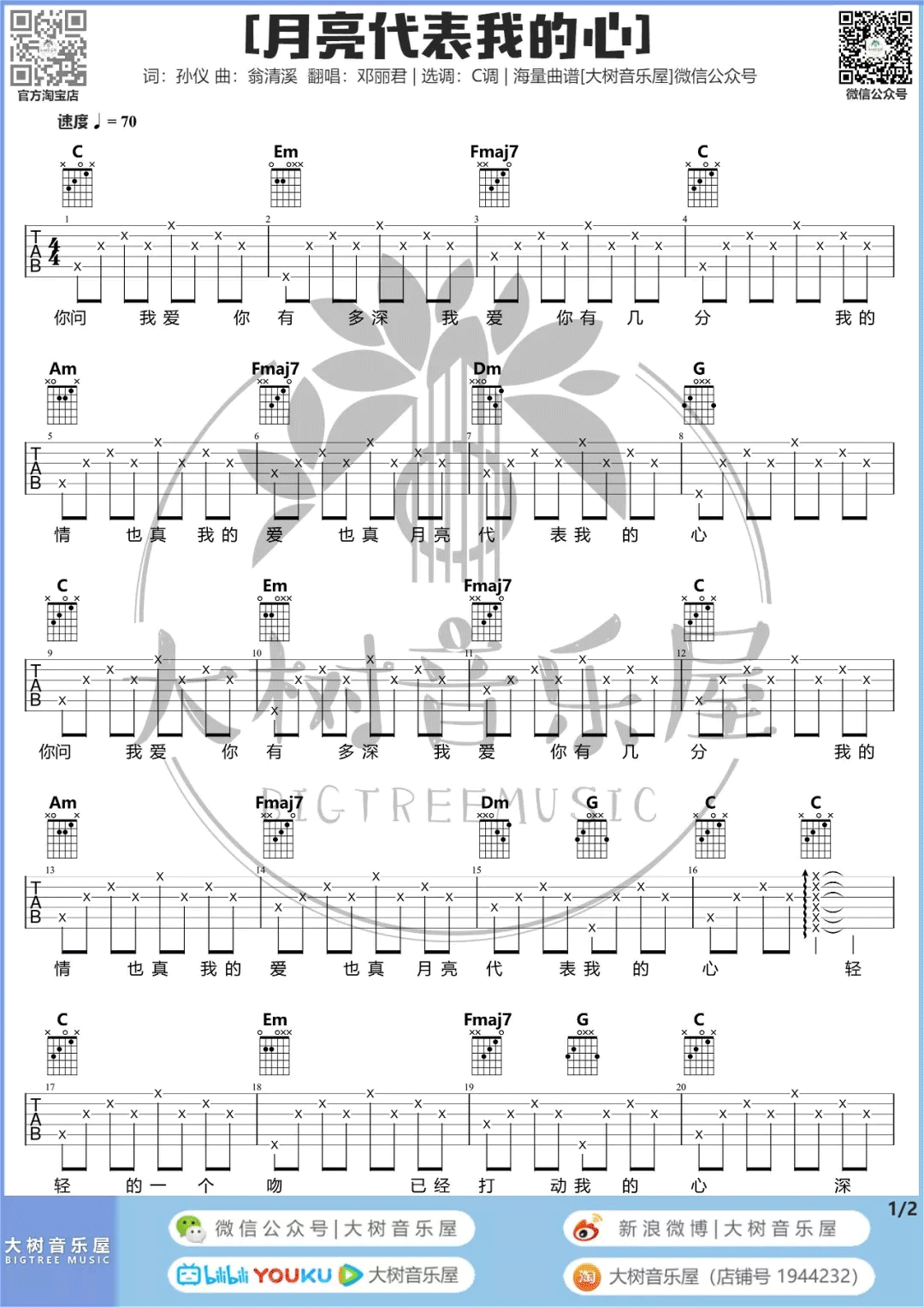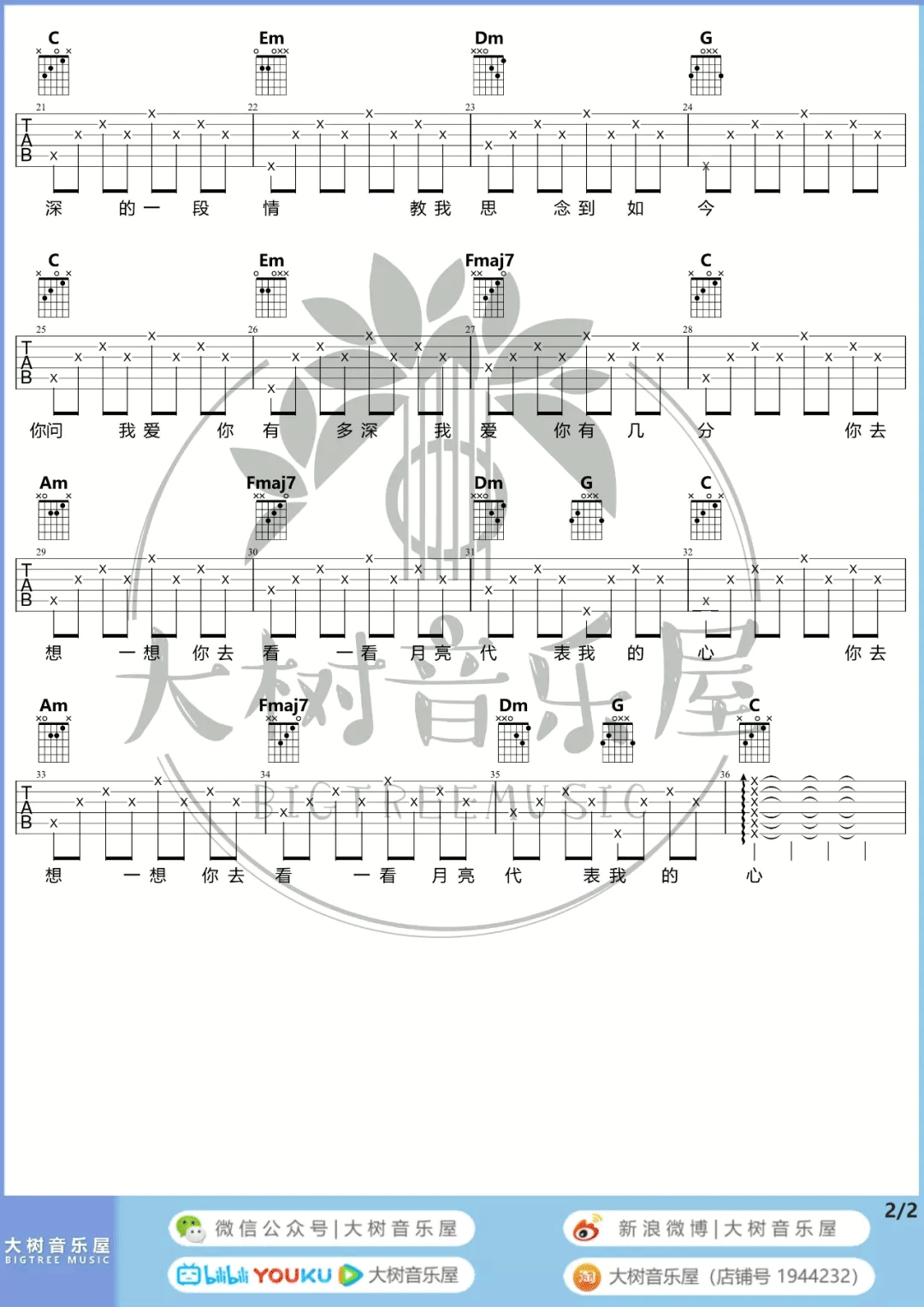 《邓丽君《月亮代表我的心吉他谱》(E调)》内容来自于互联网,不能保证内容的准确性与完整性,仅供学习交流欣赏,请勿用于其它用途,内容版权归原作者及来源网站所有,如有侵犯到您的权益请来信告知,我们将及时删除。