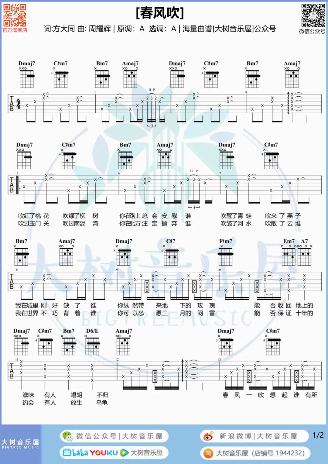 《春风吹》由方大同演唱,以C调吉他谱写,生动描绘了一段携手成长的青春爱情故事,唤起美好回忆与爱情真谛。曲谱采用4/4拍,和声进行流畅,弹奏时变调夹可夹第二品。演奏需注重节奏稳定与情感表达,突出旋律的温暖与清新。整体风格简洁而富有感染力,易于上手又充满情感层次。