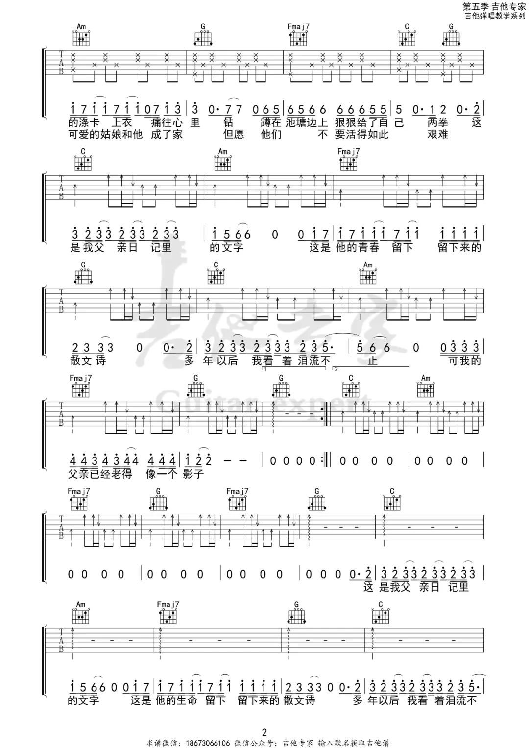 《李健《父亲写的散文诗吉他谱》(C调)》内容来自于互联网,不能保证内容的准确性与完整性,仅供学习交流欣赏,请勿用于其它用途,内容版权归原作者及来源网站所有,如有侵犯到您的权益请来信告知,我们将及时删除。