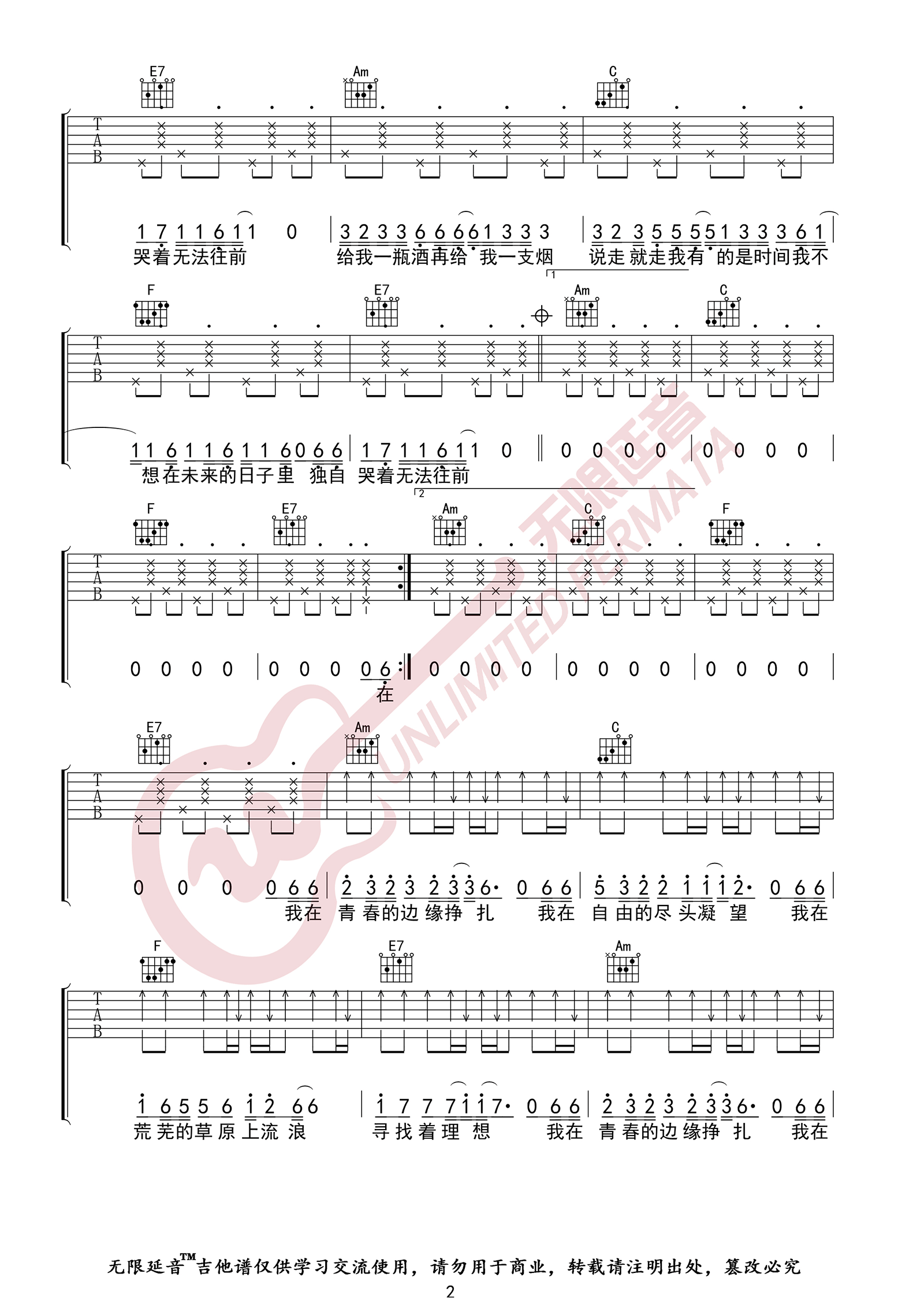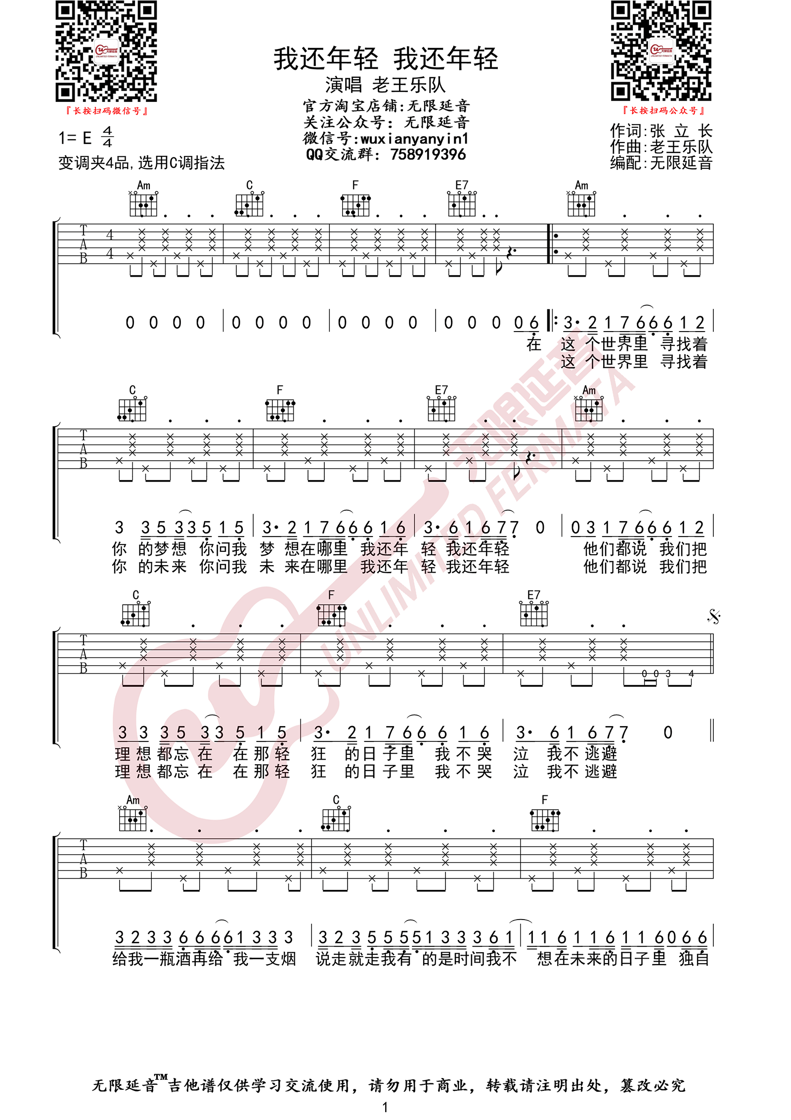 《老王乐队《我还年轻我还年轻吉他谱》(C调)》内容来自于互联网,不能保证内容的准确性与完整性,仅供学习交流欣赏,请勿用于其它用途,内容版权归原作者及来源网站所有,如有侵犯到您的权益请来信告知,我们将及时删除。