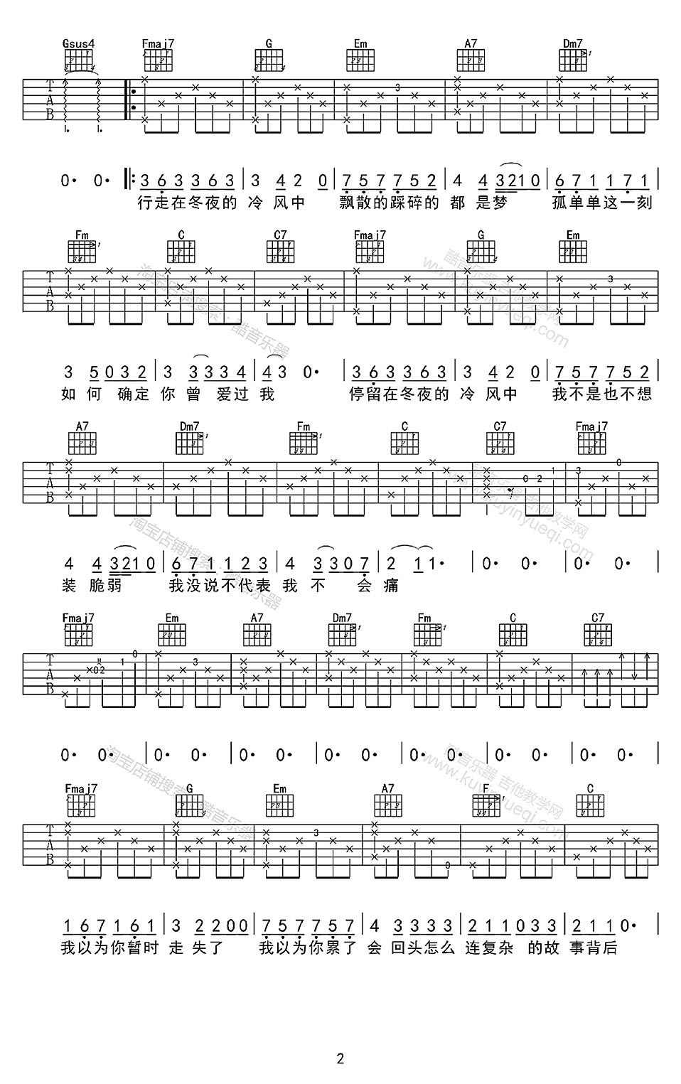 《刘思涵《走在冷风中吉他谱》(A调)》内容来自于互联网,不能保证内容的准确性与完整性,仅供学习交流欣赏,请勿用于其它用途,内容版权归原作者及来源网站所有,如有侵犯到您的权益请来信告知,我们将及时删除。