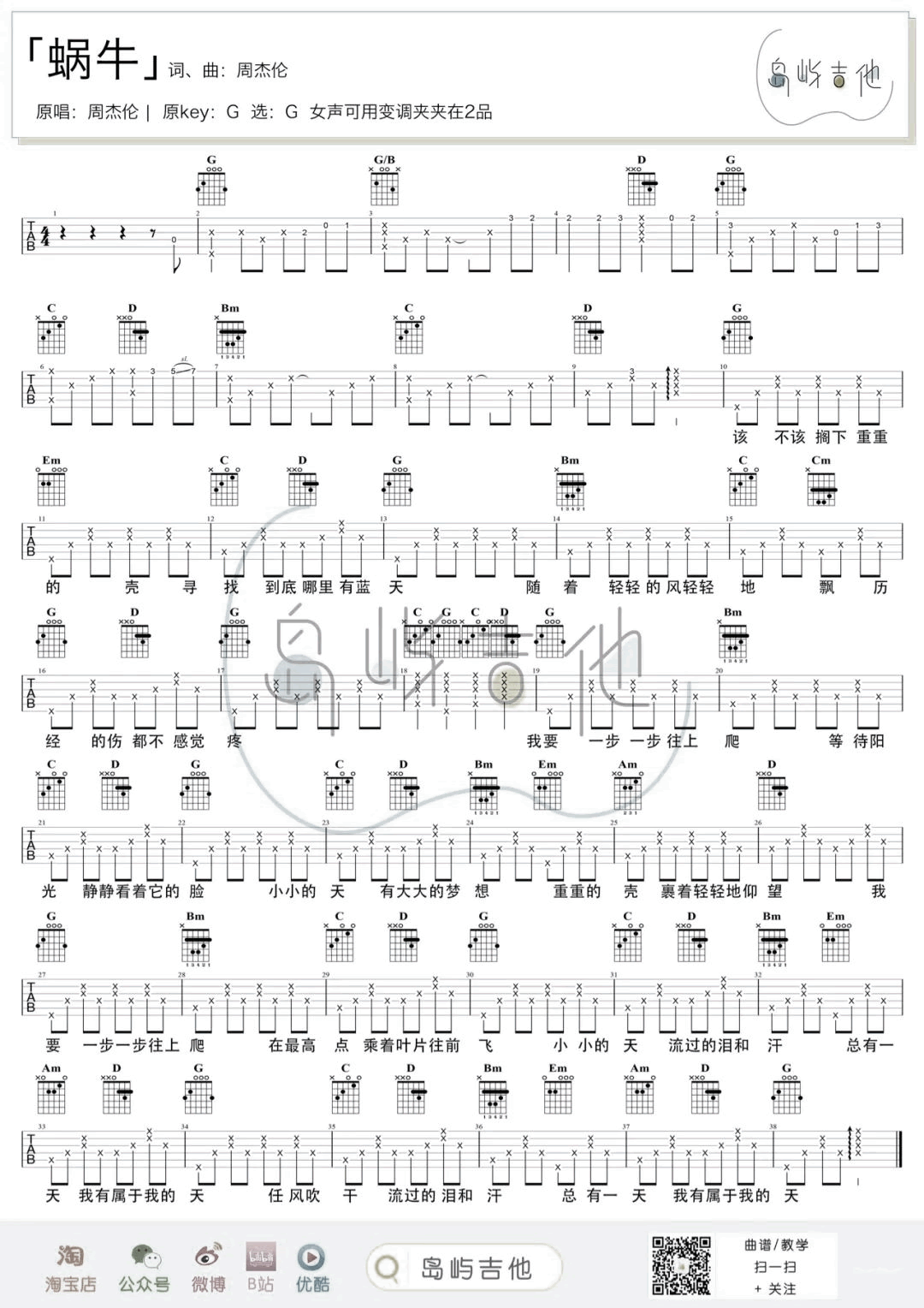 《周杰伦《蜗牛吉他谱》(G调)》内容来自于互联网,不能保证内容的准确性与完整性,仅供学习交流欣赏,请勿用于其它用途,内容版权归原作者及来源网站所有,如有侵犯到您的权益请来信告知,我们将及时删除。