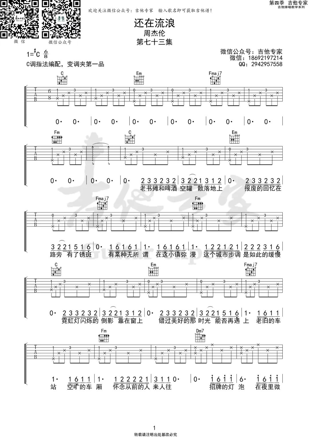 《周杰伦《还在流浪吉他谱》(G调)》内容来自于互联网,不能保证内容的准确性与完整性,仅供学习交流欣赏,请勿用于其它用途,内容版权归原作者及来源网站所有,如有侵犯到您的权益请来信告知,我们将及时删除。