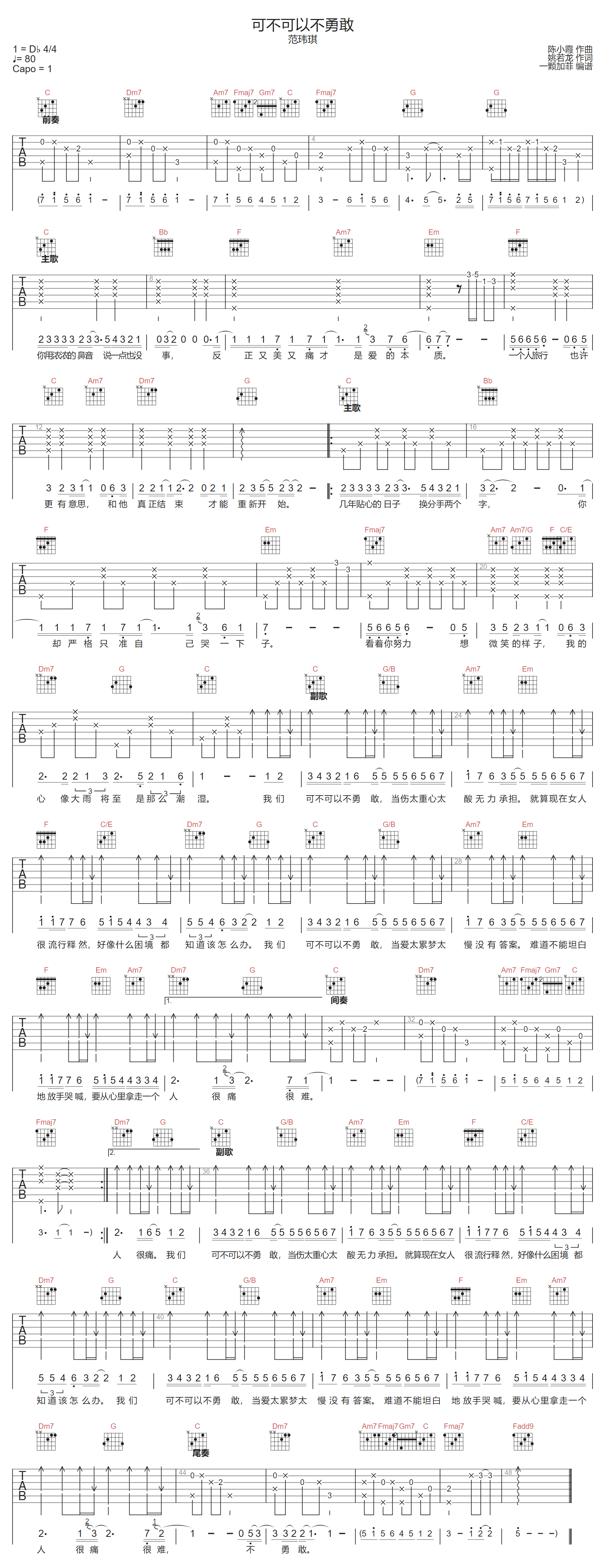 《范玮琪《可不可以不勇敢吉他谱》(C调)》内容来自于互联网,不能保证内容的准确性与完整性,仅供学习交流欣赏,请勿用于其它用途,内容版权归原作者及来源网站所有,如有侵犯到您的权益请来信告知,我们将及时删除。