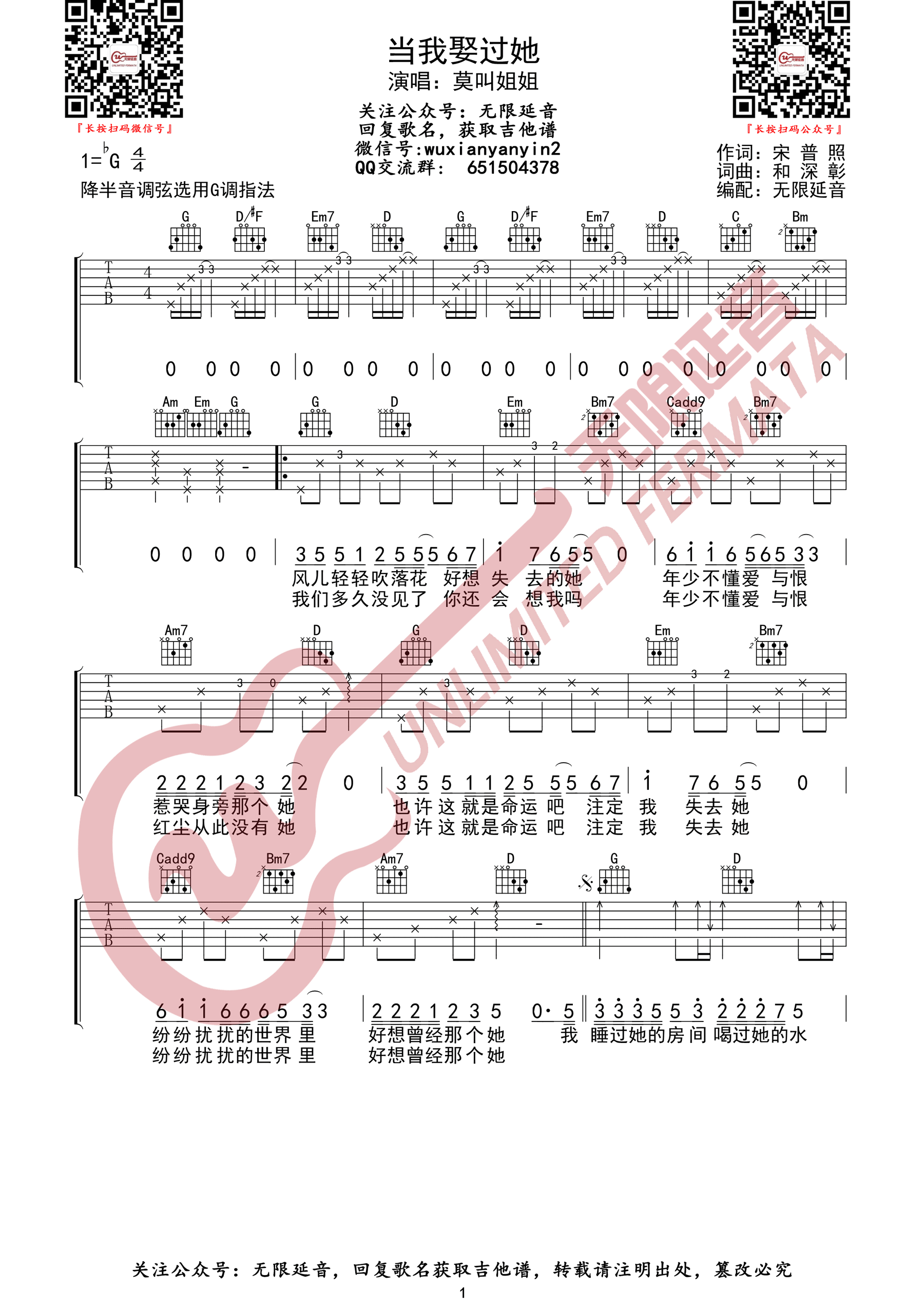 《莫叫姐姐《当我娶过她吉他谱》(F调)》内容来自于互联网,不能保证内容的准确性与完整性,仅供学习交流欣赏,请勿用于其它用途,内容版权归原作者及来源网站所有,如有侵犯到您的权益请来信告知,我们将及时删除。