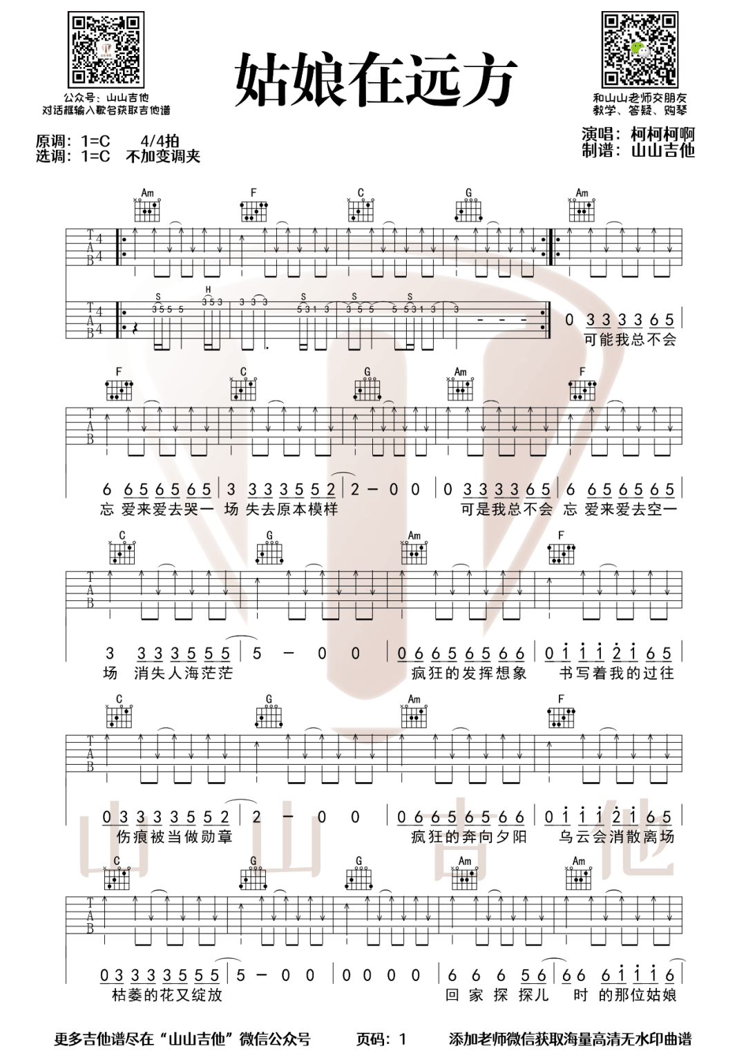 姑娘在远方柯柯柯啊演唱D调,吉他弹唱谱,本谱,弹唱建议变调夹3品,速度85BPM,节奏4/4拍,难度较简单,易上手,谱。
