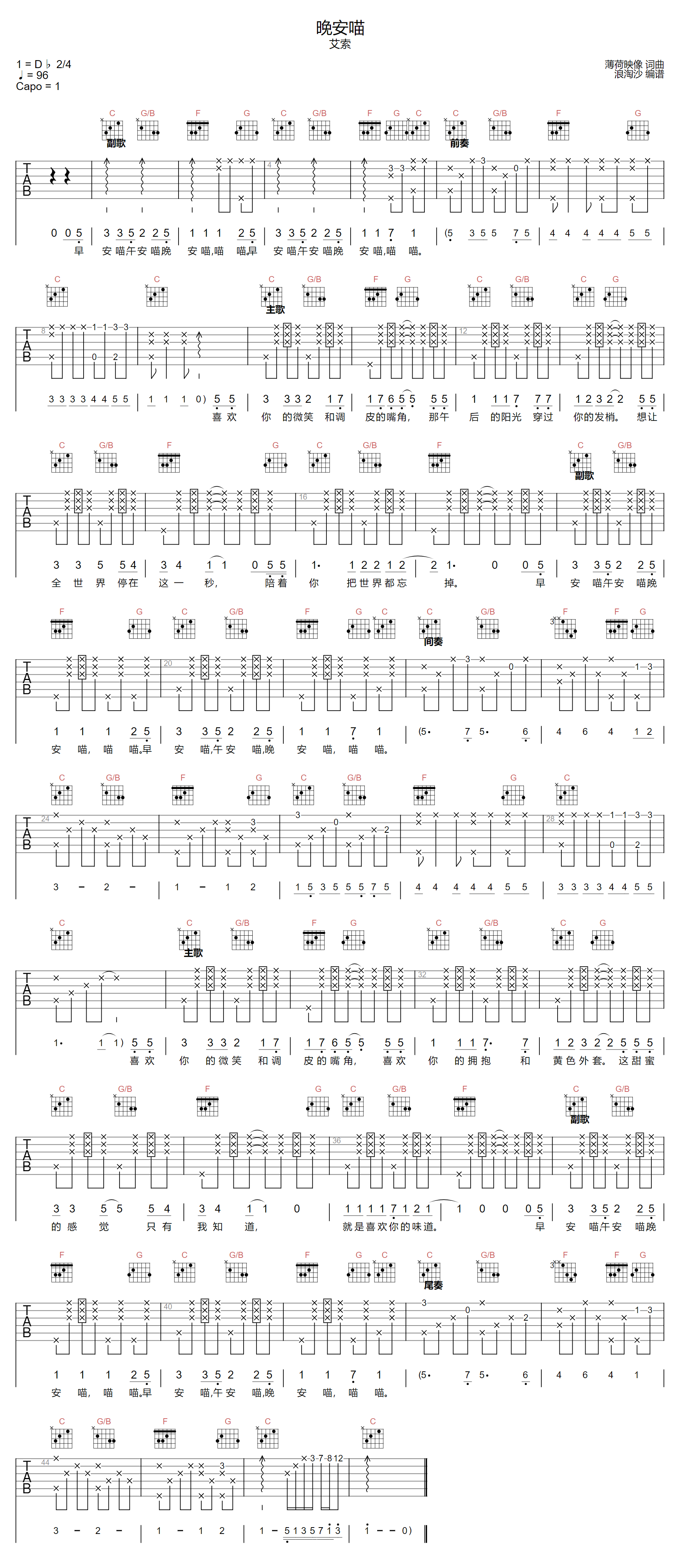 《艾索《晚安喵吉他谱》(C调)》内容来自于互联网,不能保证内容的准确性与完整性,仅供学习交流欣赏,请勿用于其它用途,内容版权归原作者及来源网站所有,如有侵犯到您的权益请来信告知,我们将及时删除。