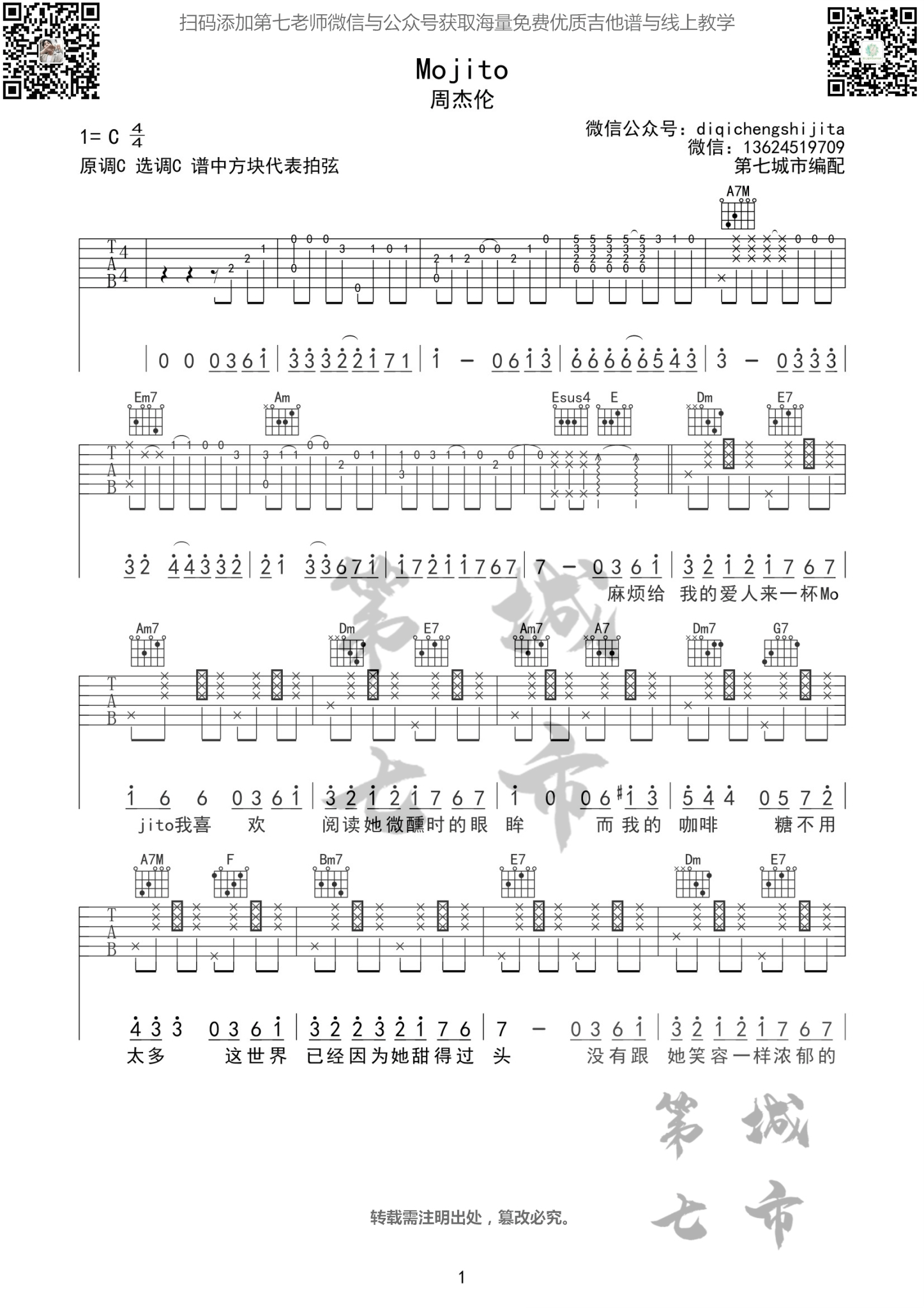 《周杰伦《Mojito吉他谱》(G调)》内容来自于互联网,不能保证内容的准确性与完整性,仅供学习交流欣赏,请勿用于其它用途,内容版权归原作者及来源网站所有,如有侵犯到您的权益请来信告知,我们将及时删除。