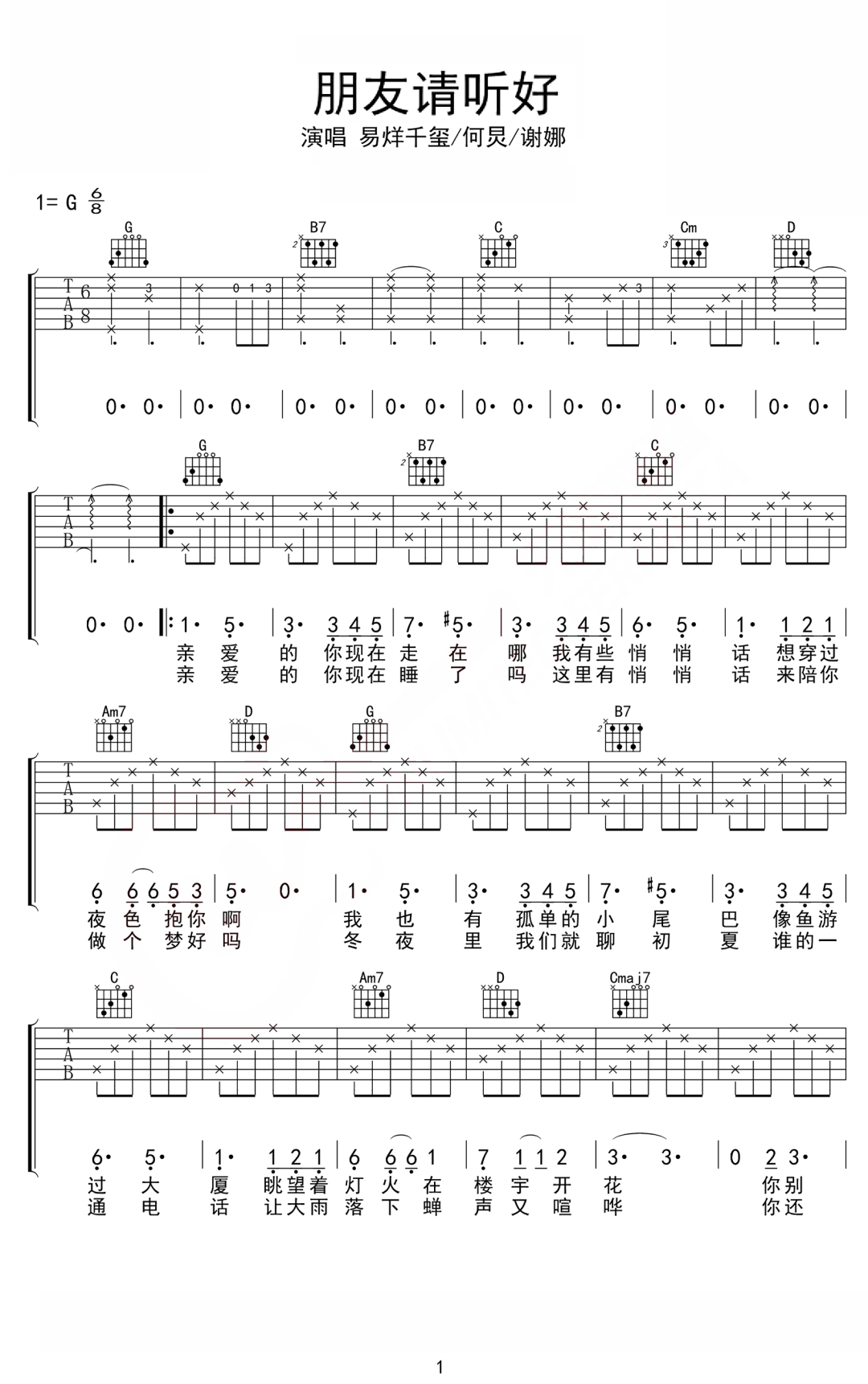 朋友请听好易烊千玺/何炅/谢娜演唱G调,易烊千玺/何炅/谢娜经典情歌,吉他弹唱谱,本谱,弹唱建议变调夹3品,速度85BPM难度较简单,易上手。