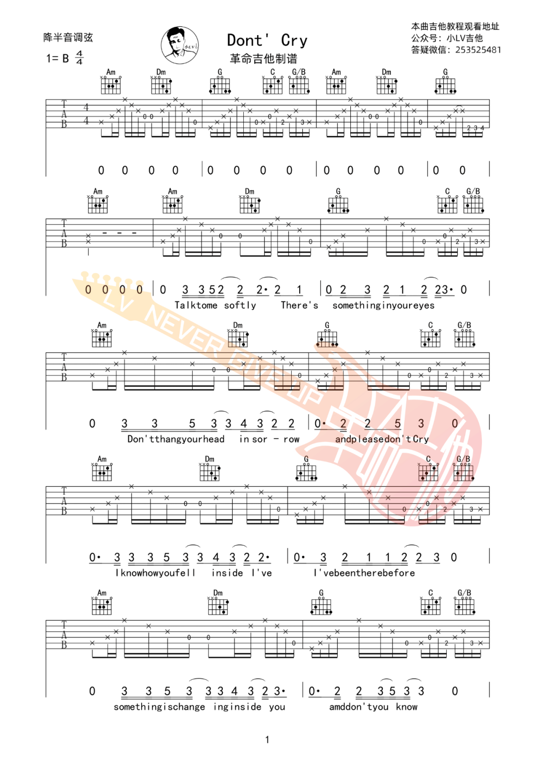 《Don't Cry》是枪花乐队的经典情歌,以细腻旋律传递深情与慰藉。歌曲采用C调编配,演奏需注重推弦、揉弦等技巧增强情感表达,副歌部分需控制力度展现层次变化。该版本谱例还原度高,包含完整前奏间奏,适合进阶练习。男生演唱建议使用变调夹夹二品,附赠教学视频详解难