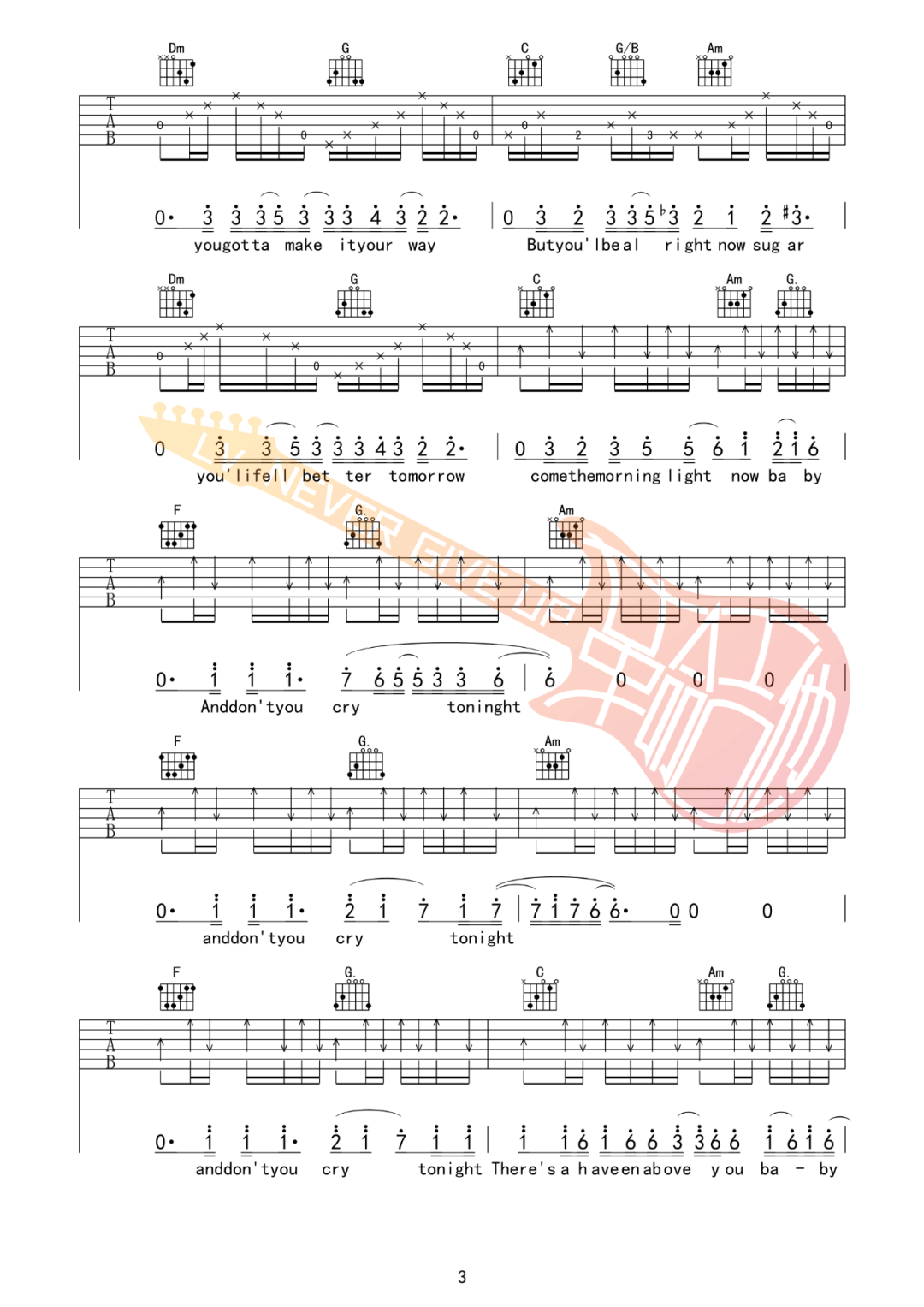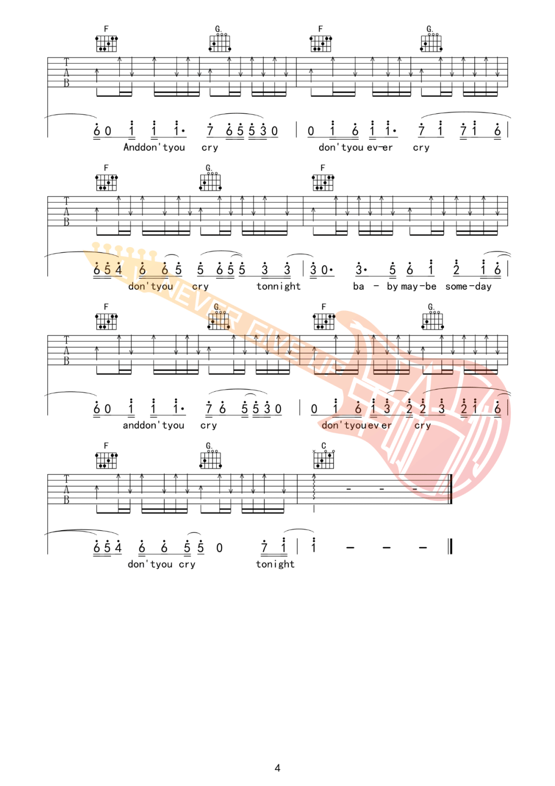 《枪花乐队《Don't Cry吉他谱》(C调)》内容来自于互联网,不能保证内容的准确性与完整性,仅供学习交流欣赏,请勿用于其它用途,内容版权归原作者及来源网站所有,如有侵犯到您的权益请来信告知,我们将及时删除。