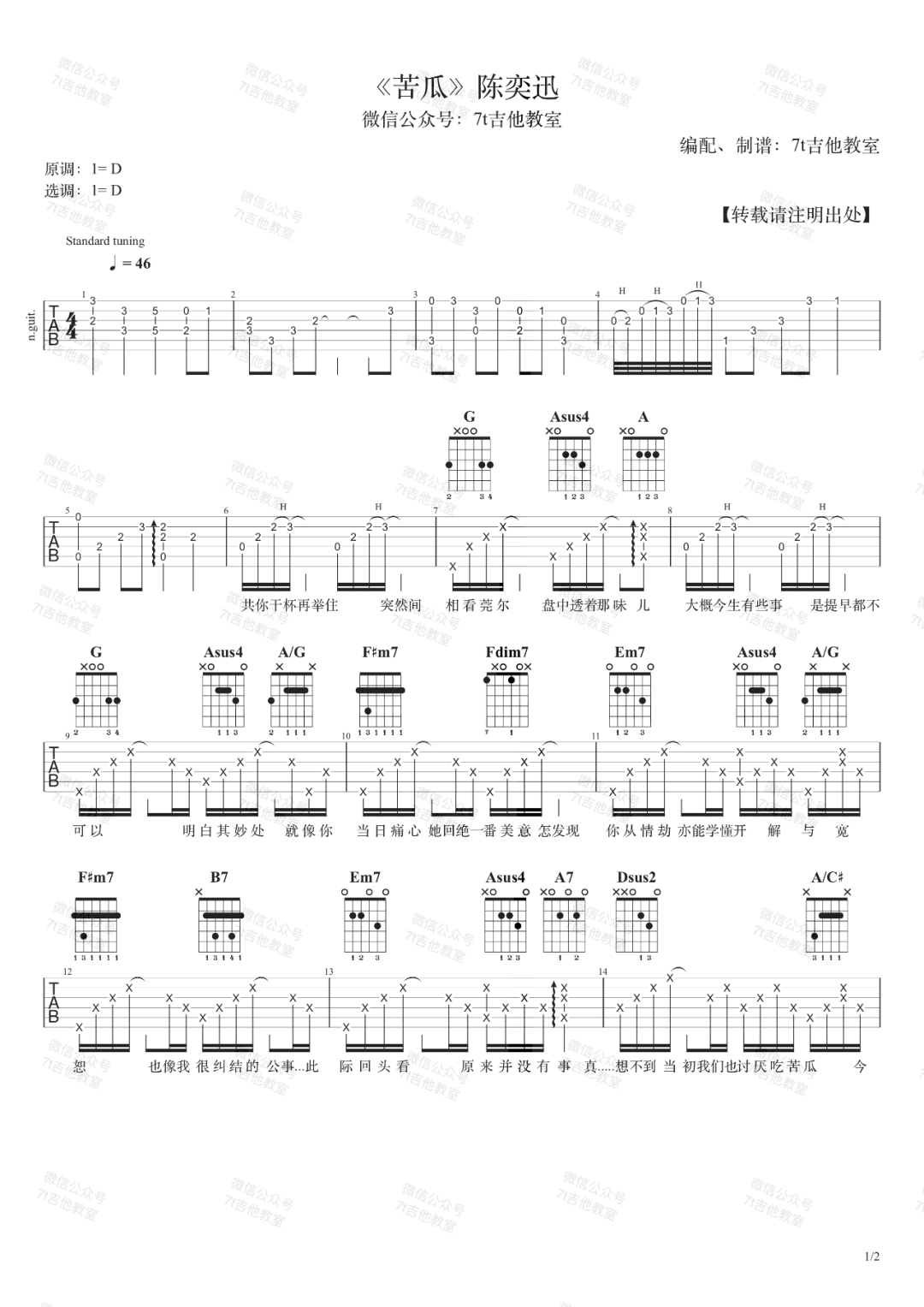 《陈奕迅《苦瓜吉他谱》(C调)》内容来自于互联网,不能保证内容的准确性与完整性,仅供学习交流欣赏,请勿用于其它用途,内容版权归原作者及来源网站所有,如有侵犯到您的权益请来信告知,我们将及时删除。