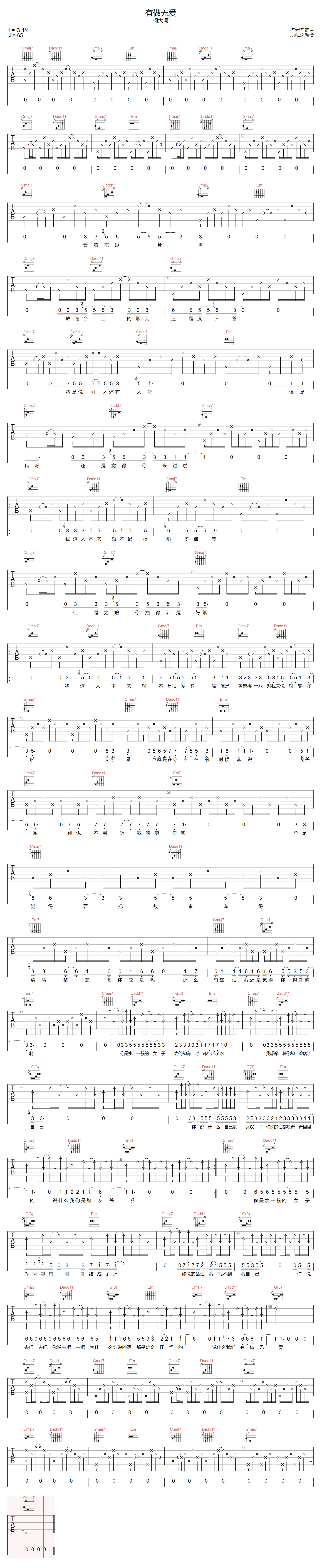 《何大河《有做无爱吉他谱》(G调)》内容来自于互联网,不能保证内容的准确性与完整性,仅供学习交流欣赏,请勿用于其它用途,内容版权归原作者及来源网站所有,如有侵犯到您的权益请来信告知,我们将及时删除。