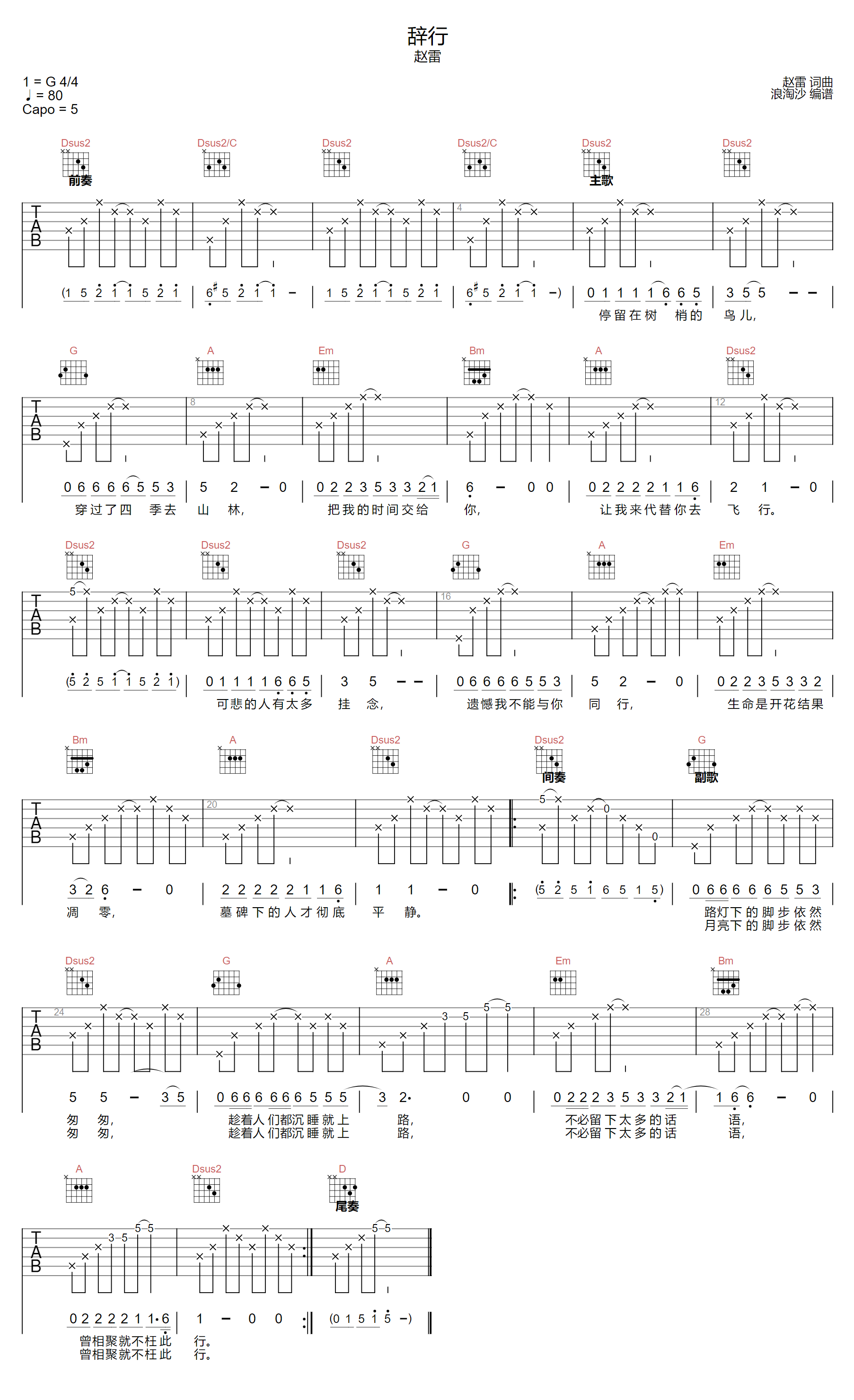 《赵雷《辞行吉他谱》(C调)》内容来自于互联网,不能保证内容的准确性与完整性,仅供学习交流欣赏,请勿用于其它用途,内容版权归原作者及来源网站所有,如有侵犯到您的权益请来信告知,我们将及时删除。