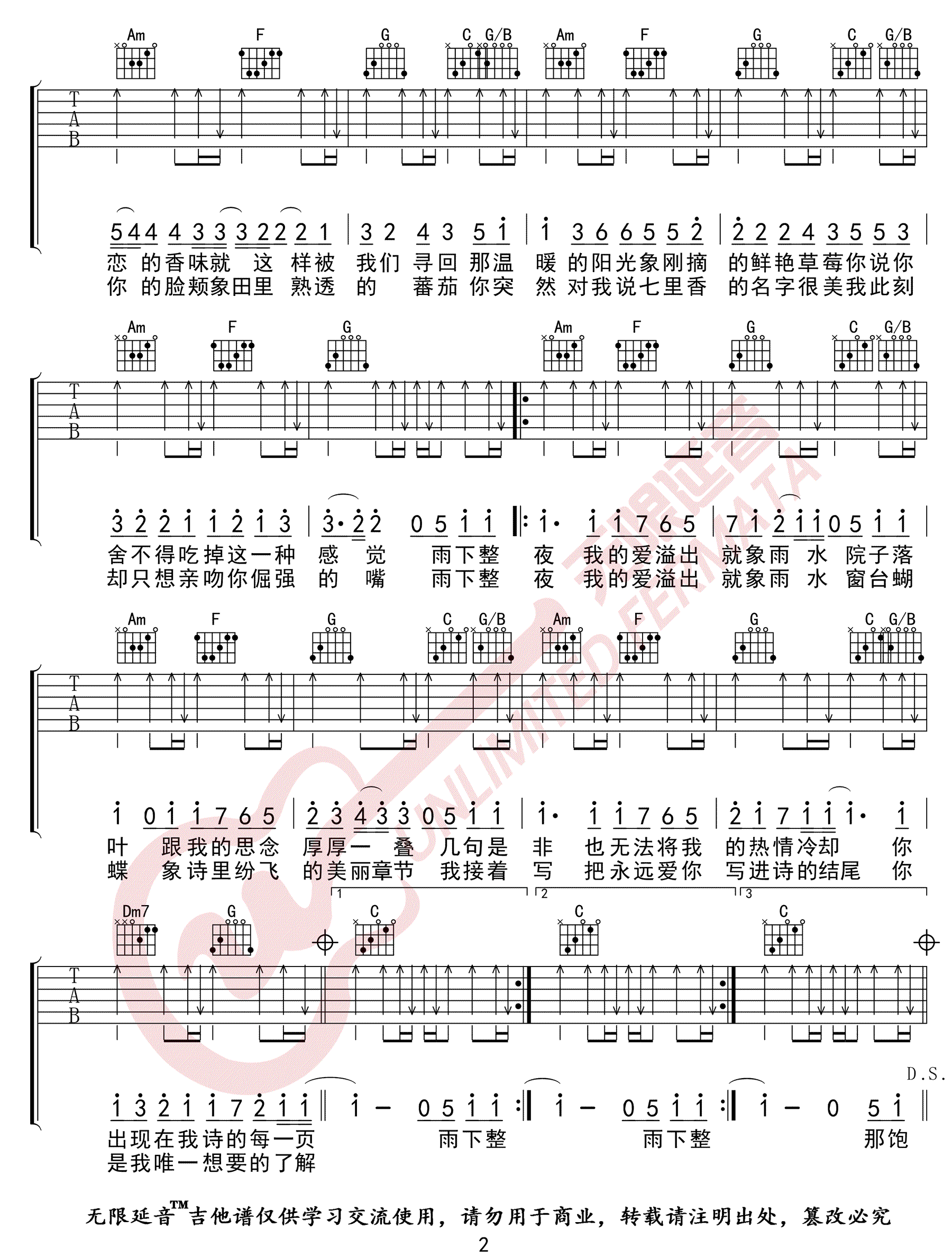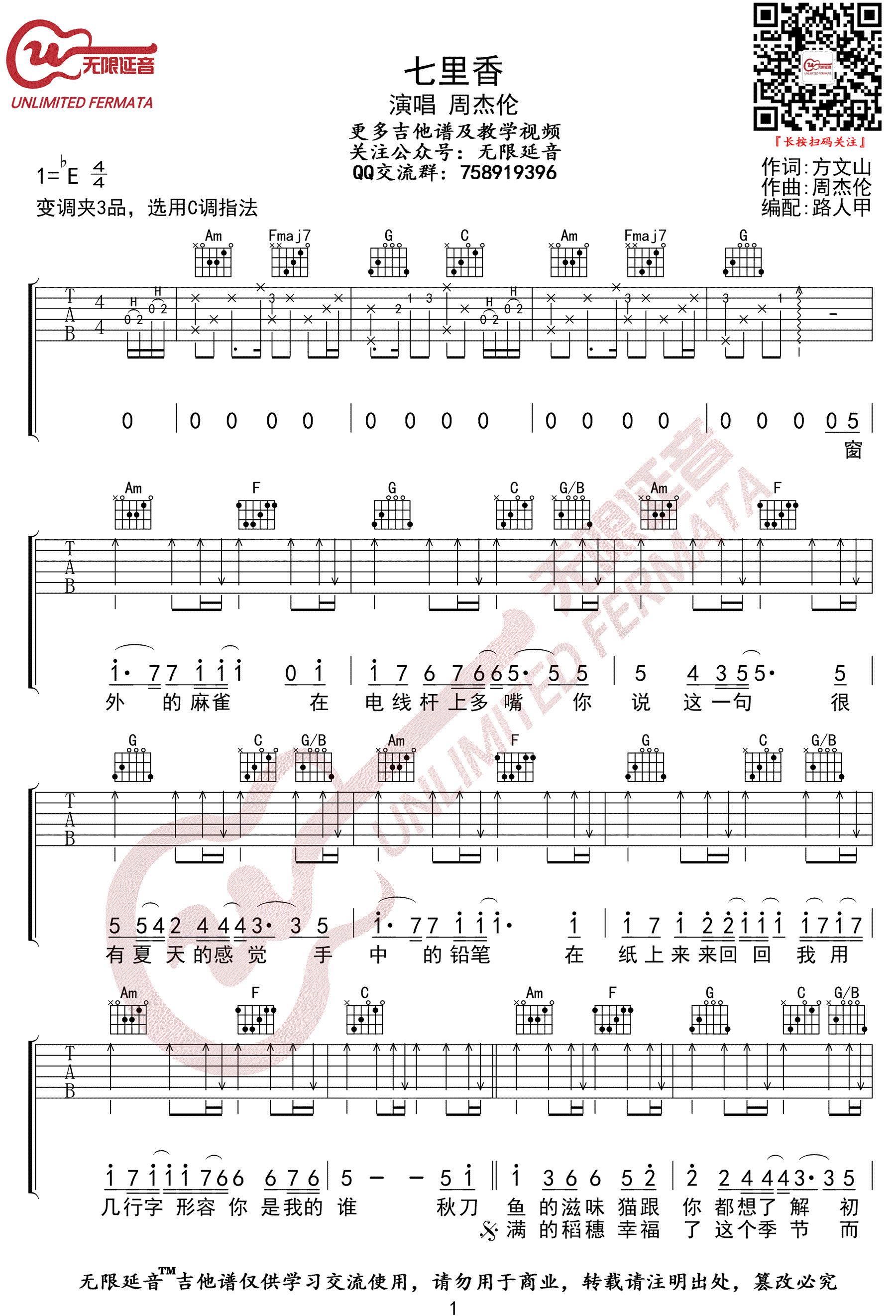 《周杰伦《七里香吉他谱》(C调)》内容来自于互联网,不能保证内容的准确性与完整性,仅供学习交流欣赏,请勿用于其它用途,内容版权归原作者及来源网站所有,如有侵犯到您的权益请来信告知,我们将及时删除。