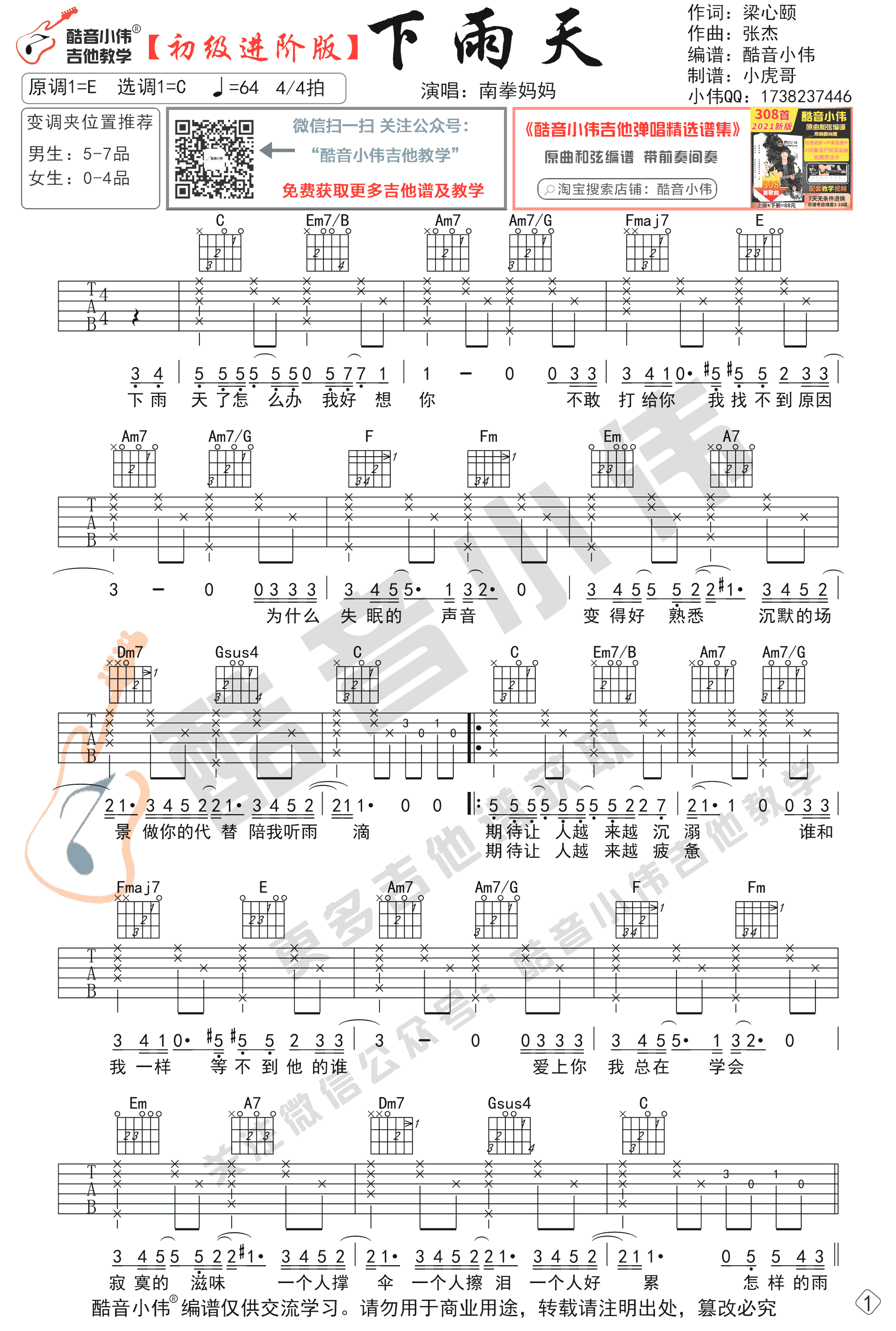 《南拳妈妈《下雨天吉他谱》(C调)》内容来自于互联网,不能保证内容的准确性与完整性,仅供学习交流欣赏,请勿用于其它用途,内容版权归原作者及来源网站所有,如有侵犯到您的权益请来信告知,我们将及时删除。