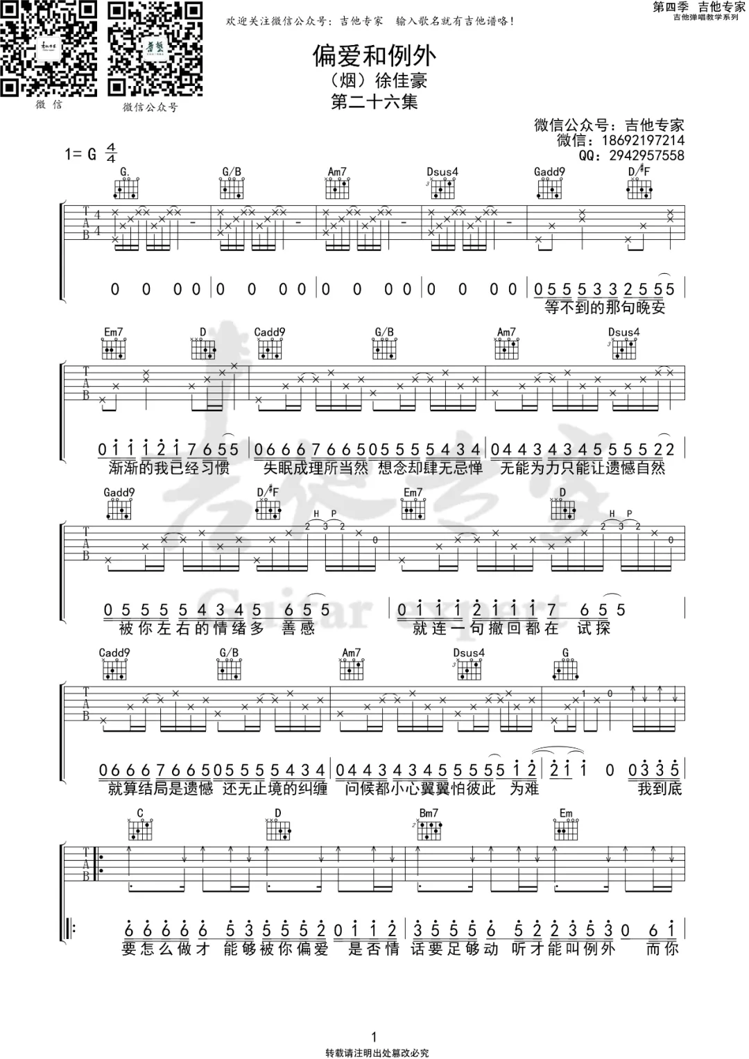 《烟(许佳豪)《偏爱和例外吉他谱》(E调)》内容来自于互联网,不能保证内容的准确性与完整性,仅供学习交流欣赏,请勿用于其它用途,内容版权归原作者及来源网站所有,如有侵犯到您的权益请来信告知,我们将及时删除。