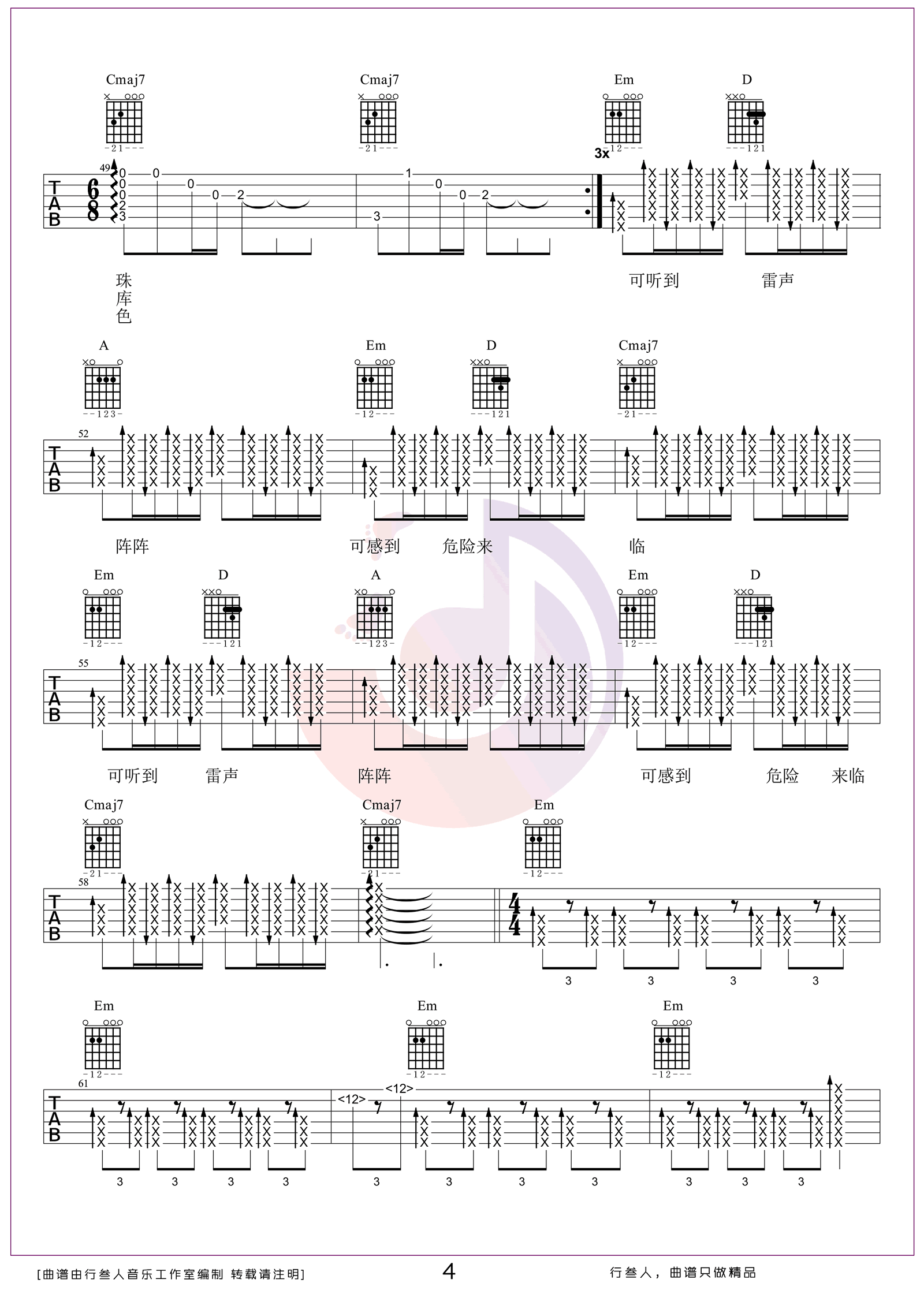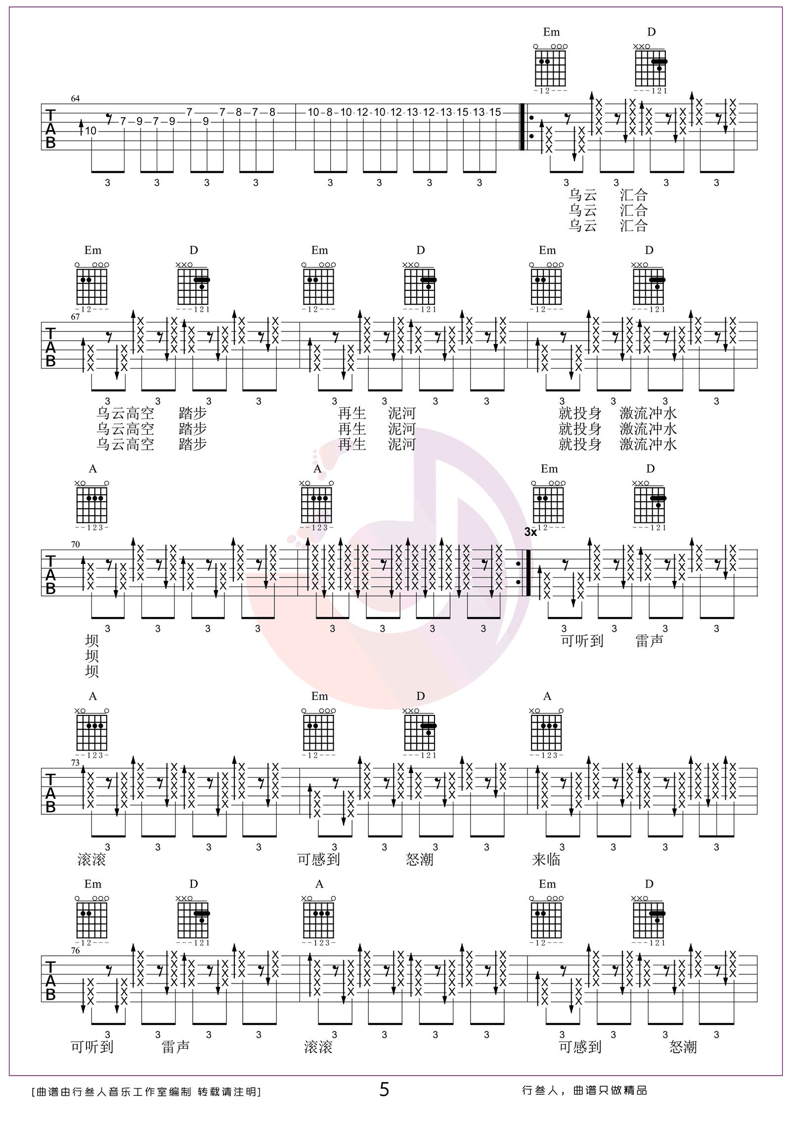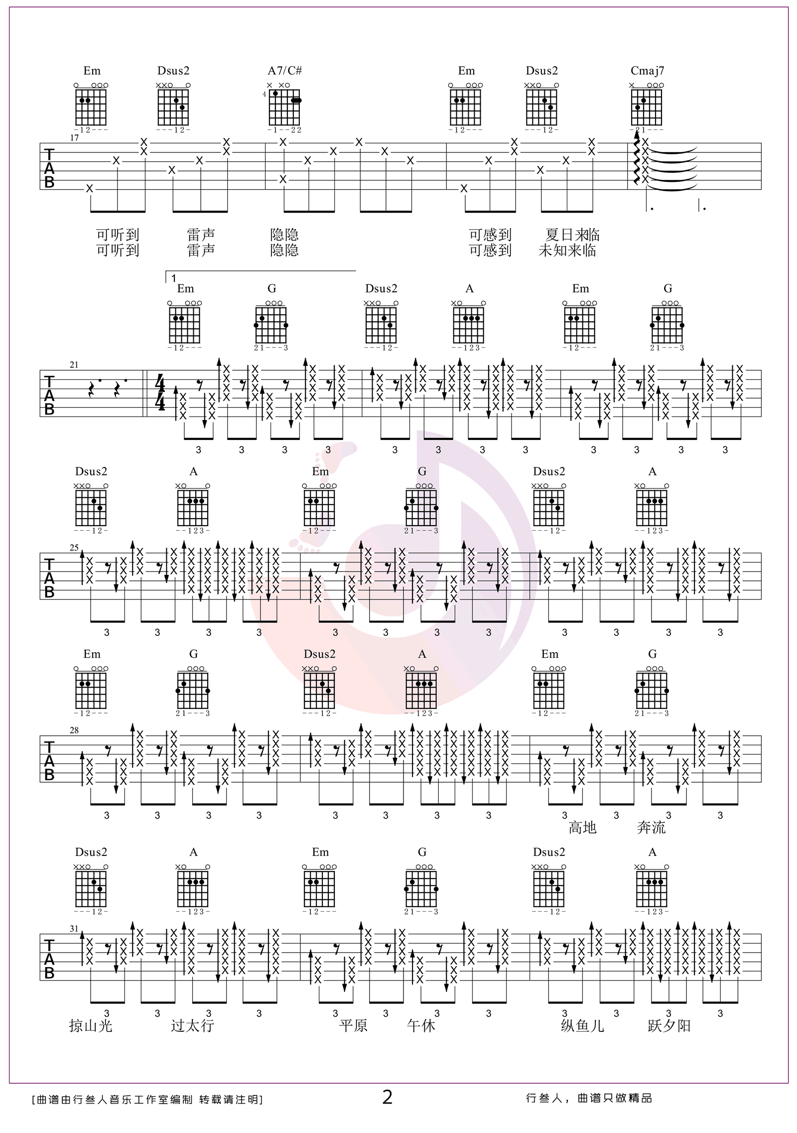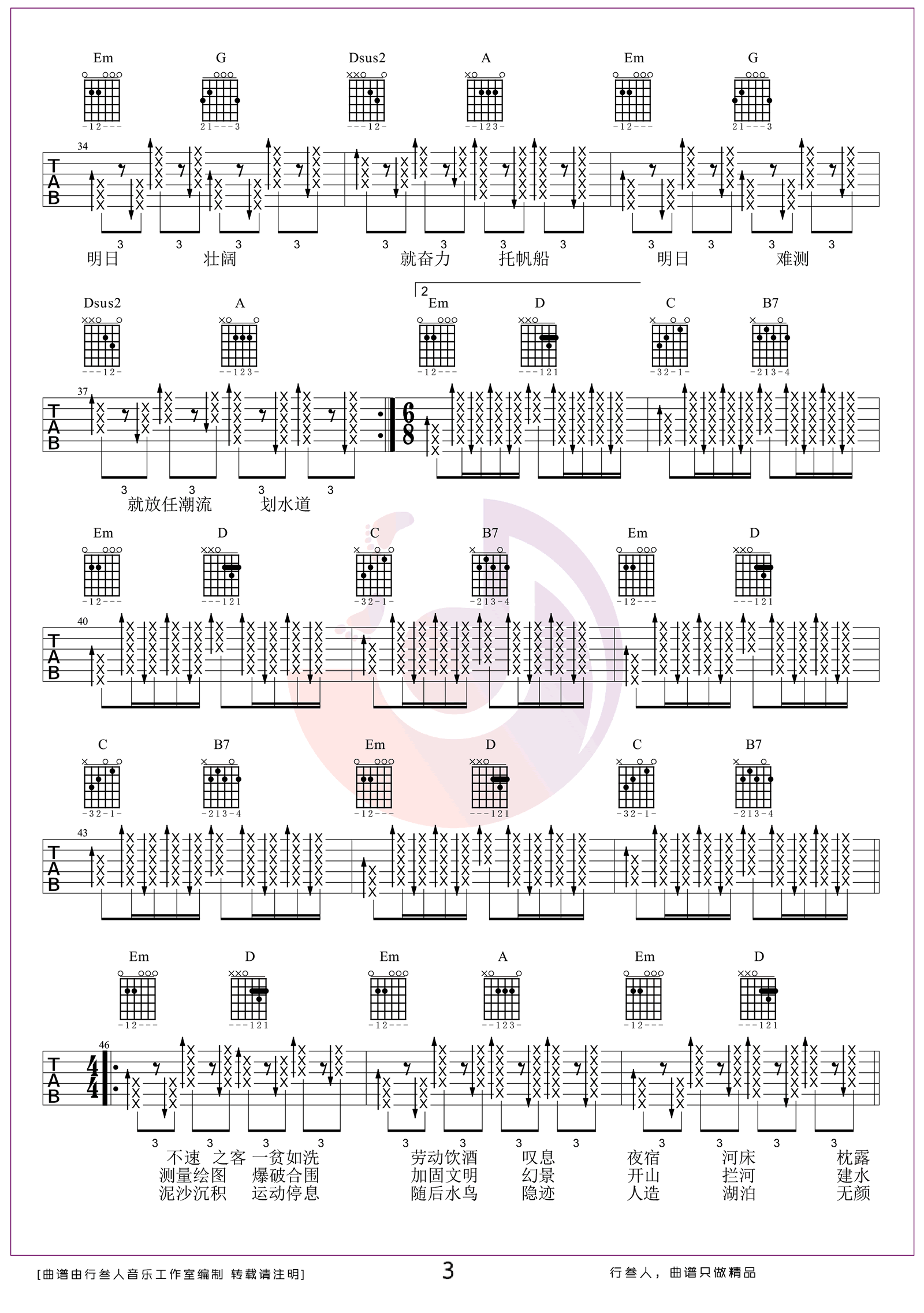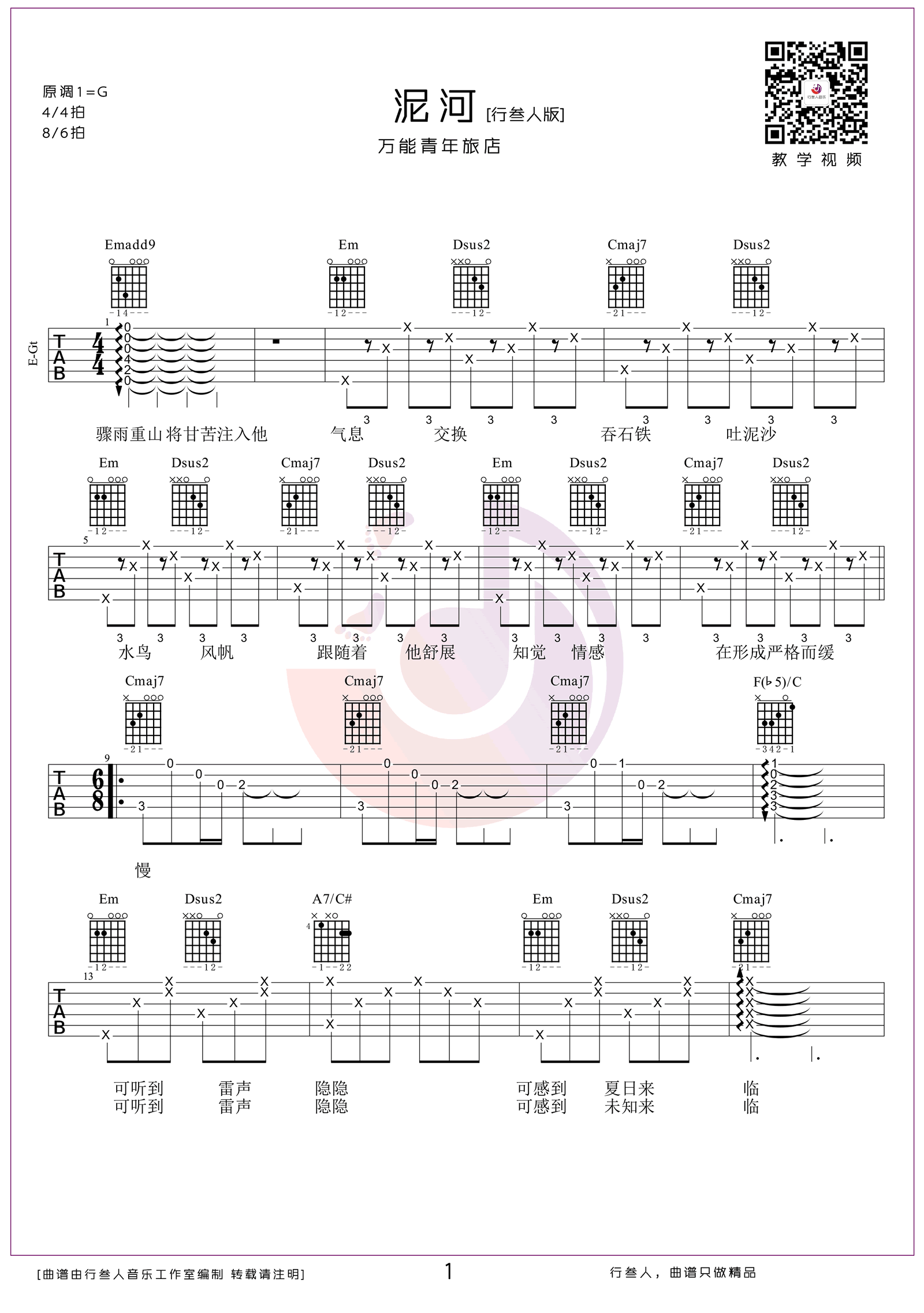 《泥河》由万能青年旅店演唱,采用C调编曲,表达了对生活与命运的深沉思考。歌曲情感层次丰富,前奏部分弹奏难度较高,需注重节奏与力度的把控。后半段运用大量封闭式和弦,增强了音乐的张力与表现力,使整体更具感染力。此版本根据原曲改编,变调夹夹5品,适合进阶吉他手练习。