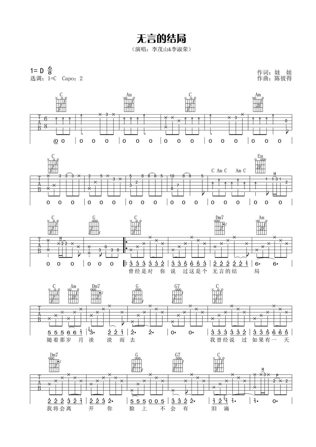 《李茂山/李淑荣《无言的结局吉他谱》(F调)》内容来自于互联网,不能保证内容的准确性与完整性,仅供学习交流欣赏,请勿用于其它用途,内容版权归原作者及来源网站所有,如有侵犯到您的权益请来信告知,我们将及时删除。