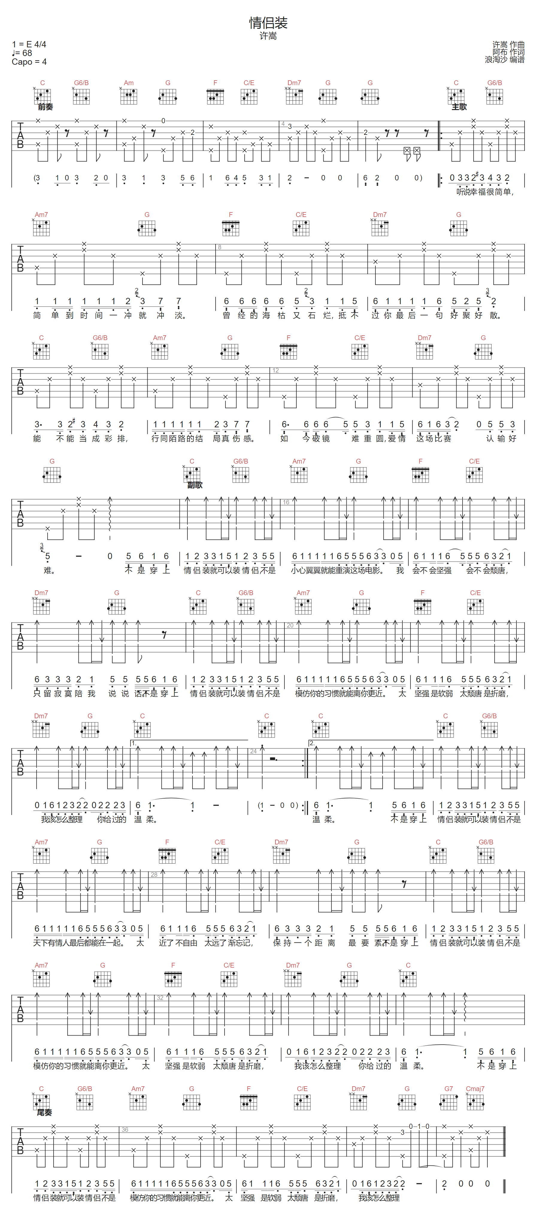 《许嵩《情侣装吉他谱》(C调)》内容来自于互联网,不能保证内容的准确性与完整性,仅供学习交流欣赏,请勿用于其它用途,内容版权归原作者及来源网站所有,如有侵犯到您的权益请来信告知,我们将及时删除。