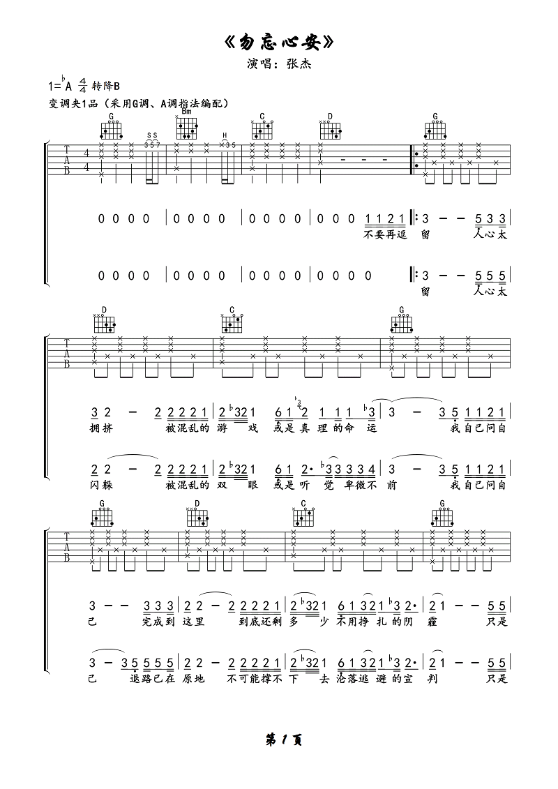 《张杰《勿忘心安吉他谱》(G调)》内容来自于互联网,不能保证内容的准确性与完整性,仅供学习交流欣赏,请勿用于其它用途,内容版权归原作者及来源网站所有,如有侵犯到您的权益请来信告知,我们将及时删除。