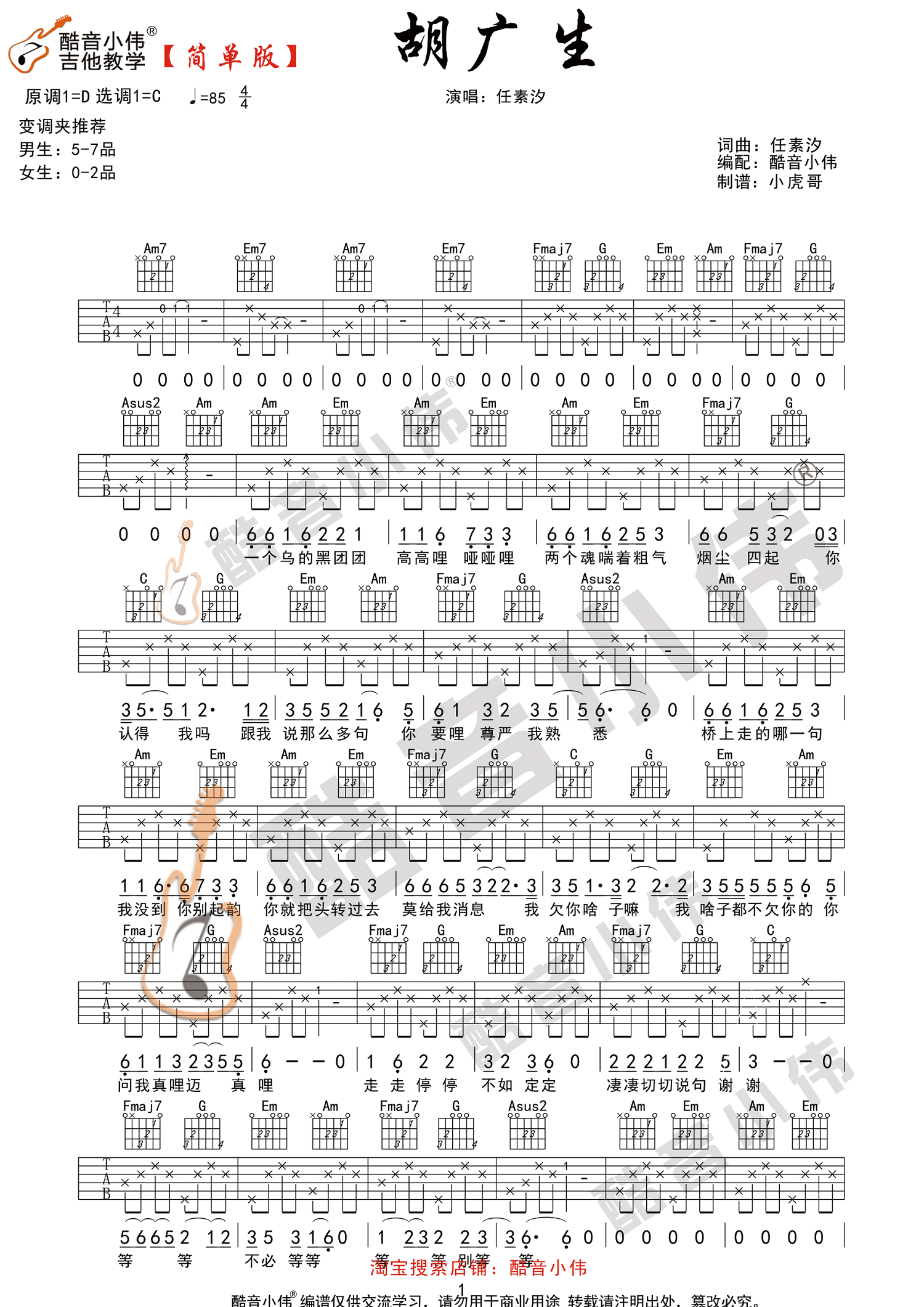 《任素汐《胡广生吉他谱》(G调)》内容来自于互联网,不能保证内容的准确性与完整性,仅供学习交流欣赏,请勿用于其它用途,内容版权归原作者及来源网站所有,如有侵犯到您的权益请来信告知,我们将及时删除。