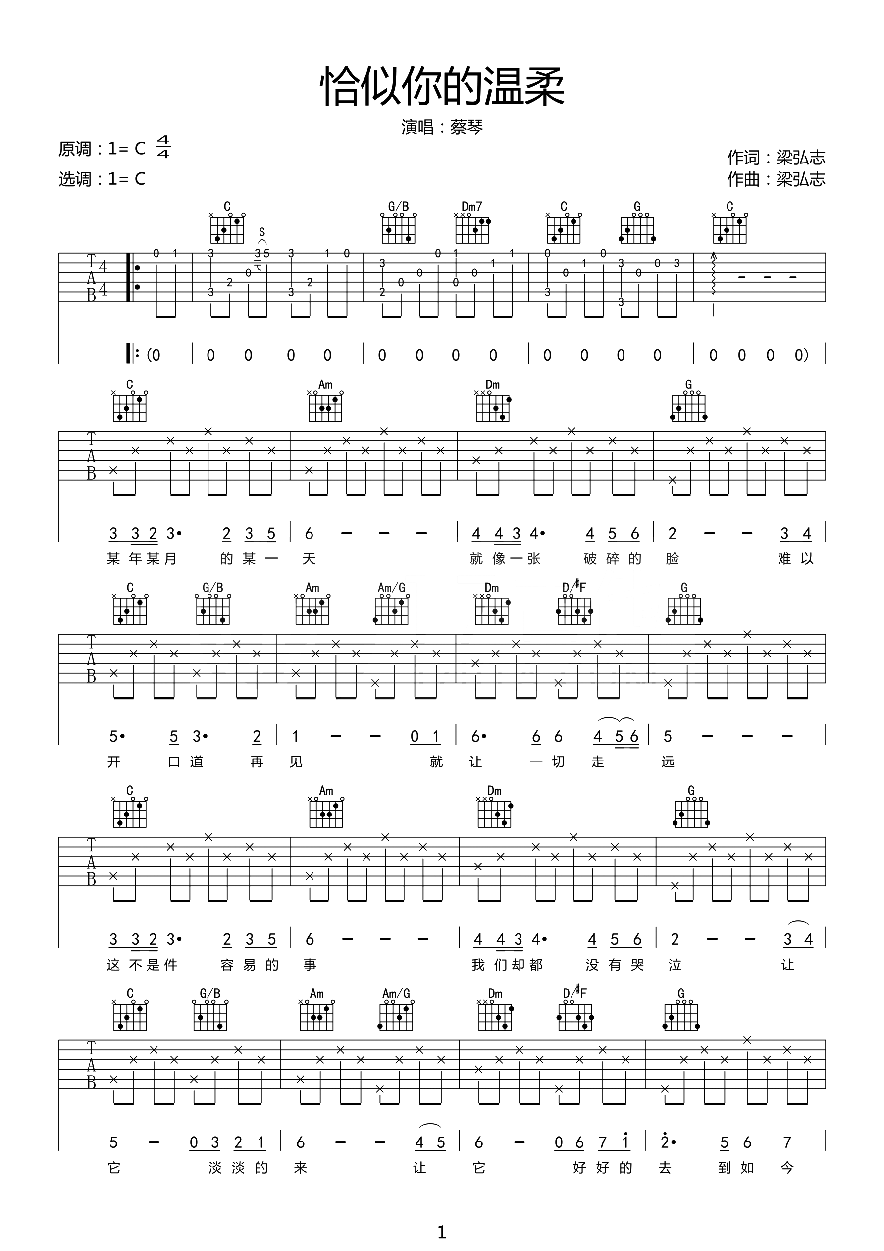 《蔡琴《恰似你的温柔吉他谱》(C调)》内容来自于互联网,不能保证内容的准确性与完整性,仅供学习交流欣赏,请勿用于其它用途,内容版权归原作者及来源网站所有,如有侵犯到您的权益请来信告知,我们将及时删除。