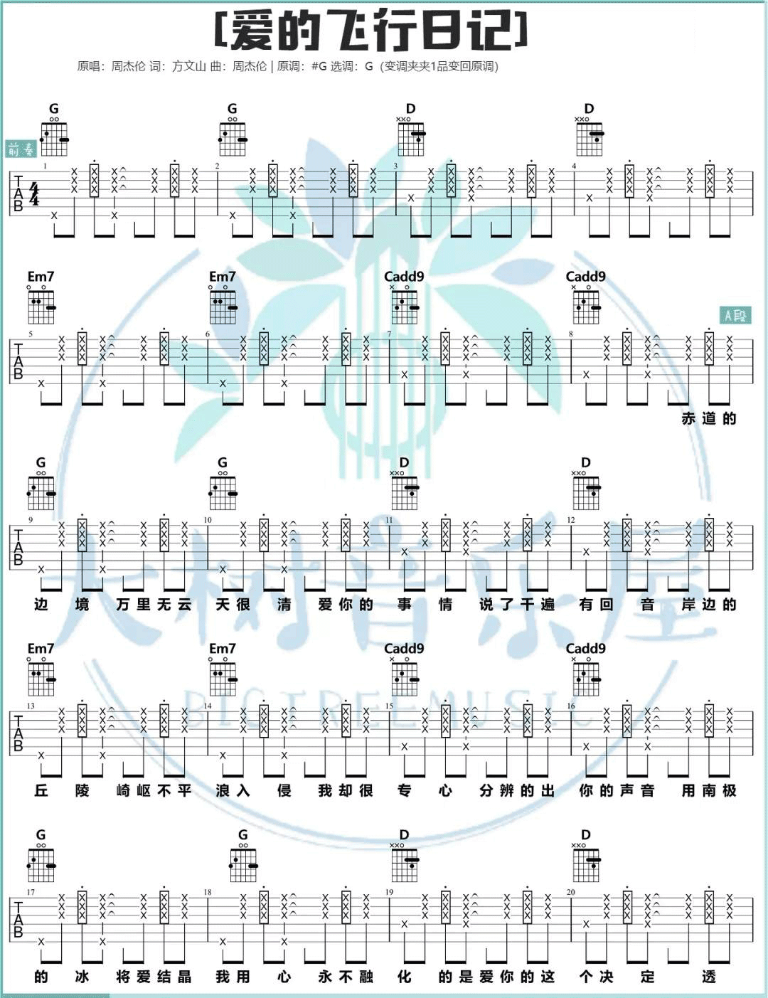《周杰伦《爱的飞行日记吉他谱》(C调)》内容来自于互联网,不能保证内容的准确性与完整性,仅供学习交流欣赏,请勿用于其它用途,内容版权归原作者及来源网站所有,如有侵犯到您的权益请来信告知,我们将及时删除。