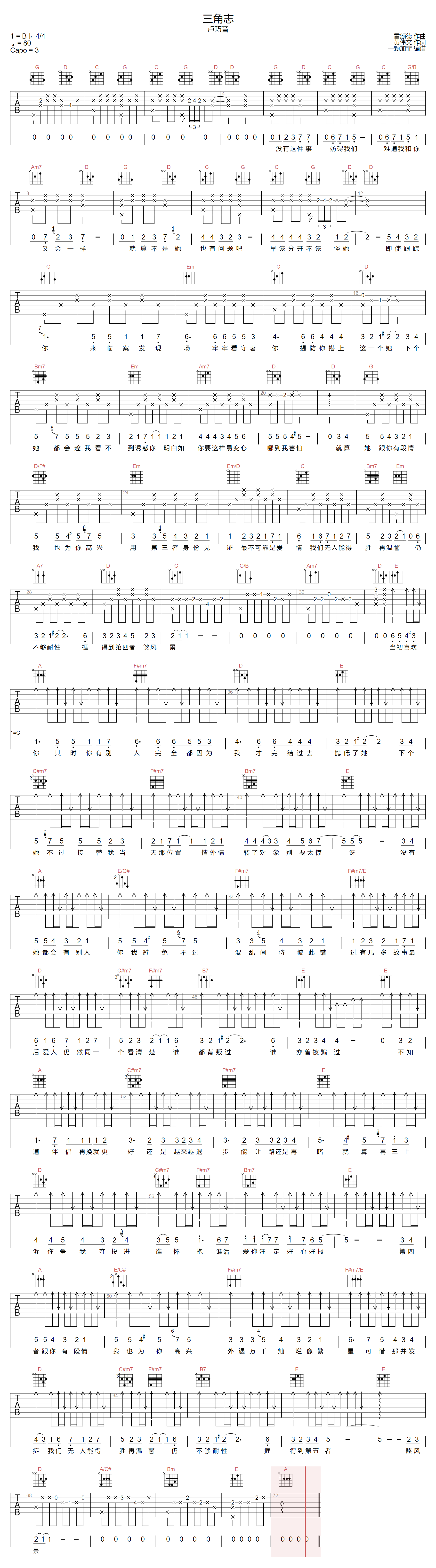 《卢巧音《三角志吉他谱》(C调)》内容来自于互联网,不能保证内容的准确性与完整性,仅供学习交流欣赏,请勿用于其它用途,内容版权归原作者及来源网站所有,如有侵犯到您的权益请来信告知,我们将及时删除。