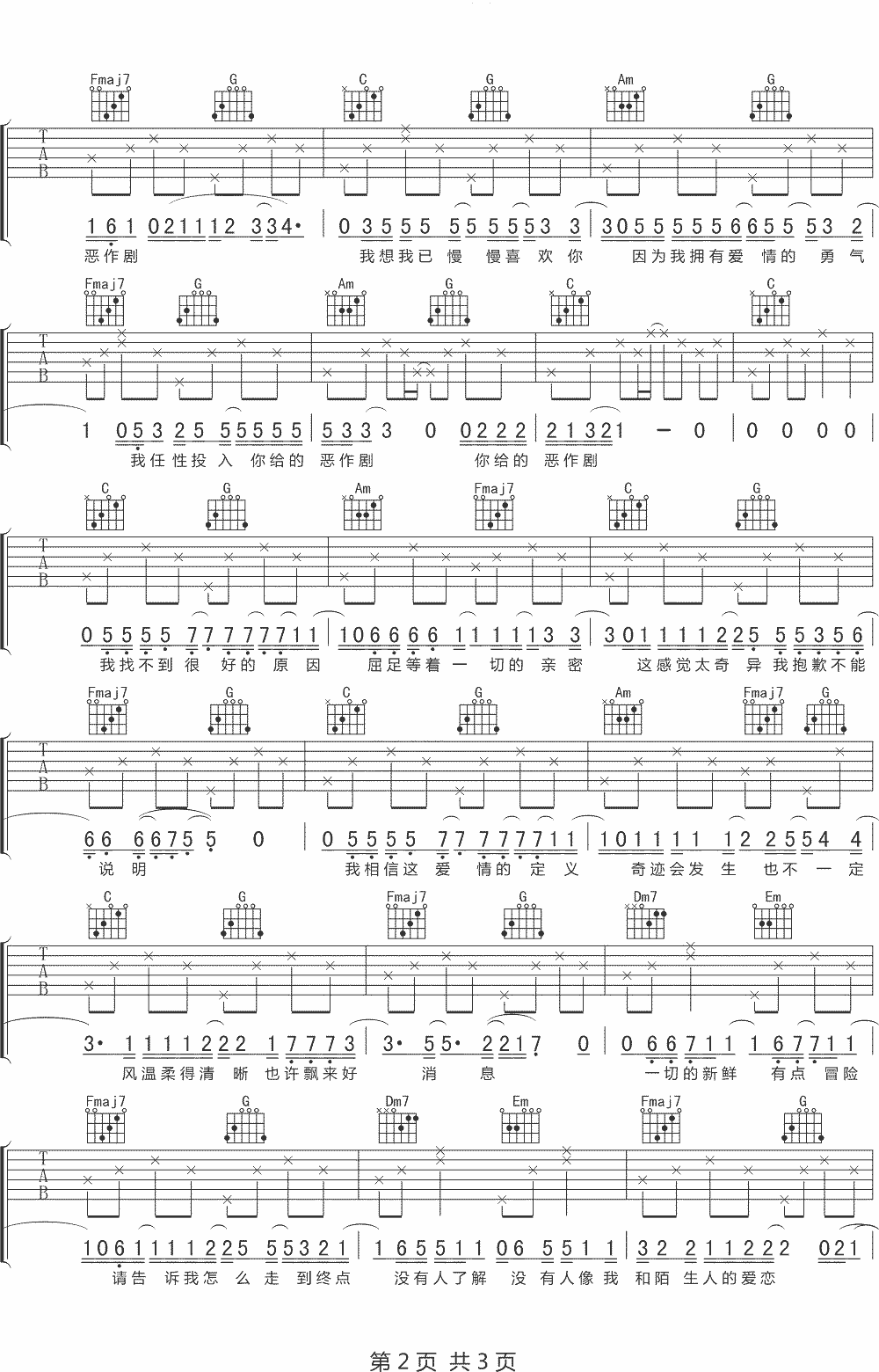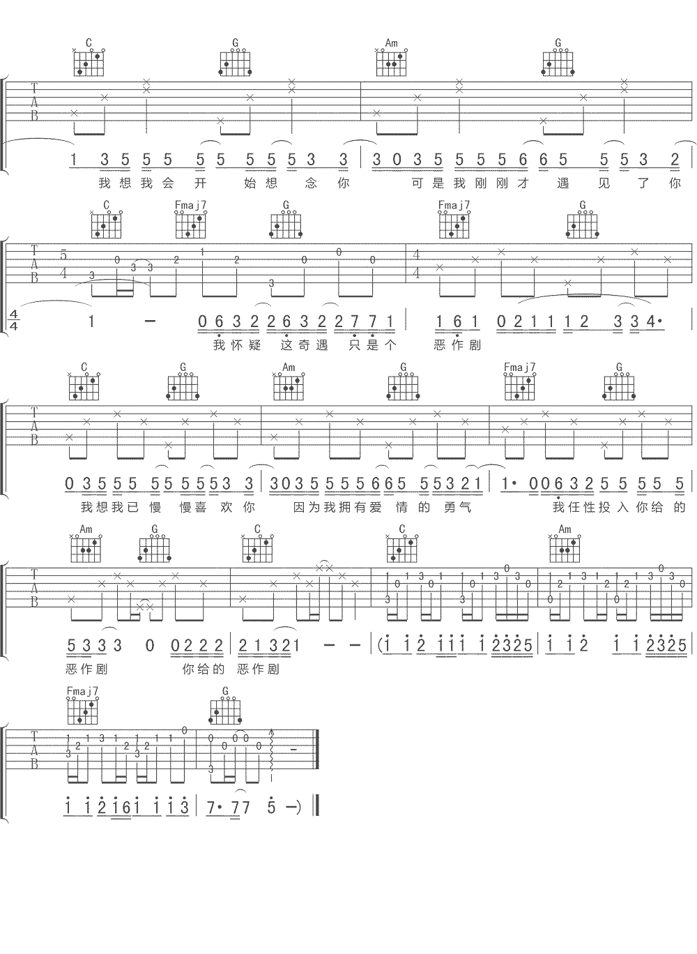 《沈以诚/王蓝茵《恶作剧吉他谱》(C调)》内容来自于互联网,不能保证内容的准确性与完整性,仅供学习交流欣赏,请勿用于其它用途,内容版权归原作者及来源网站所有,如有侵犯到您的权益请来信告知,我们将及时删除。