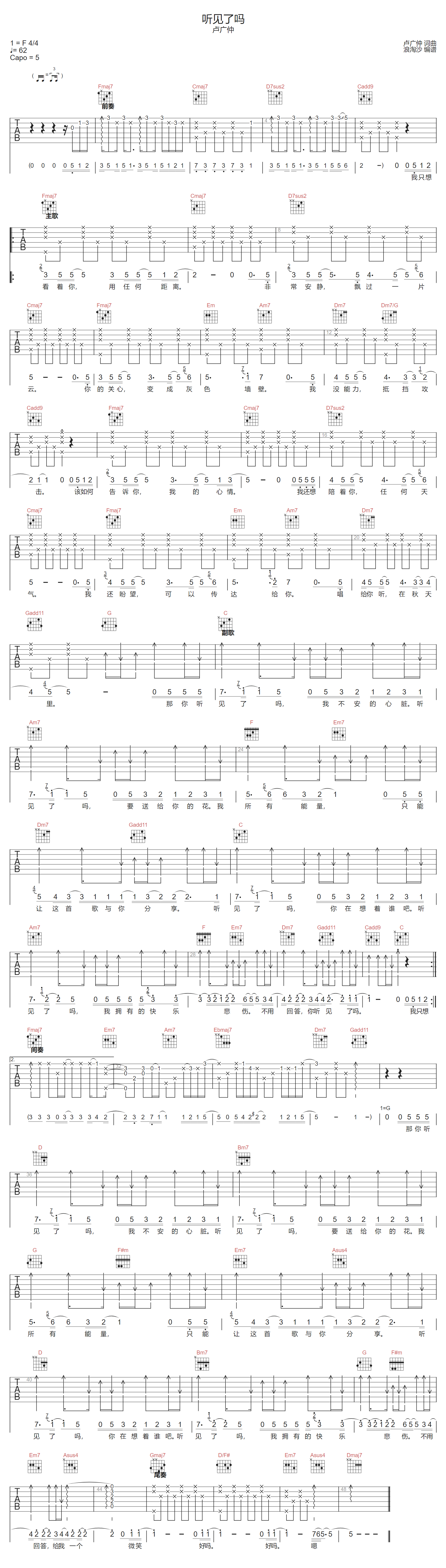 《卢广仲《听见了吗吉他谱》(C调)》内容来自于互联网,不能保证内容的准确性与完整性,仅供学习交流欣赏,请勿用于其它用途,内容版权归原作者及来源网站所有,如有侵犯到您的权益请来信告知,我们将及时删除。