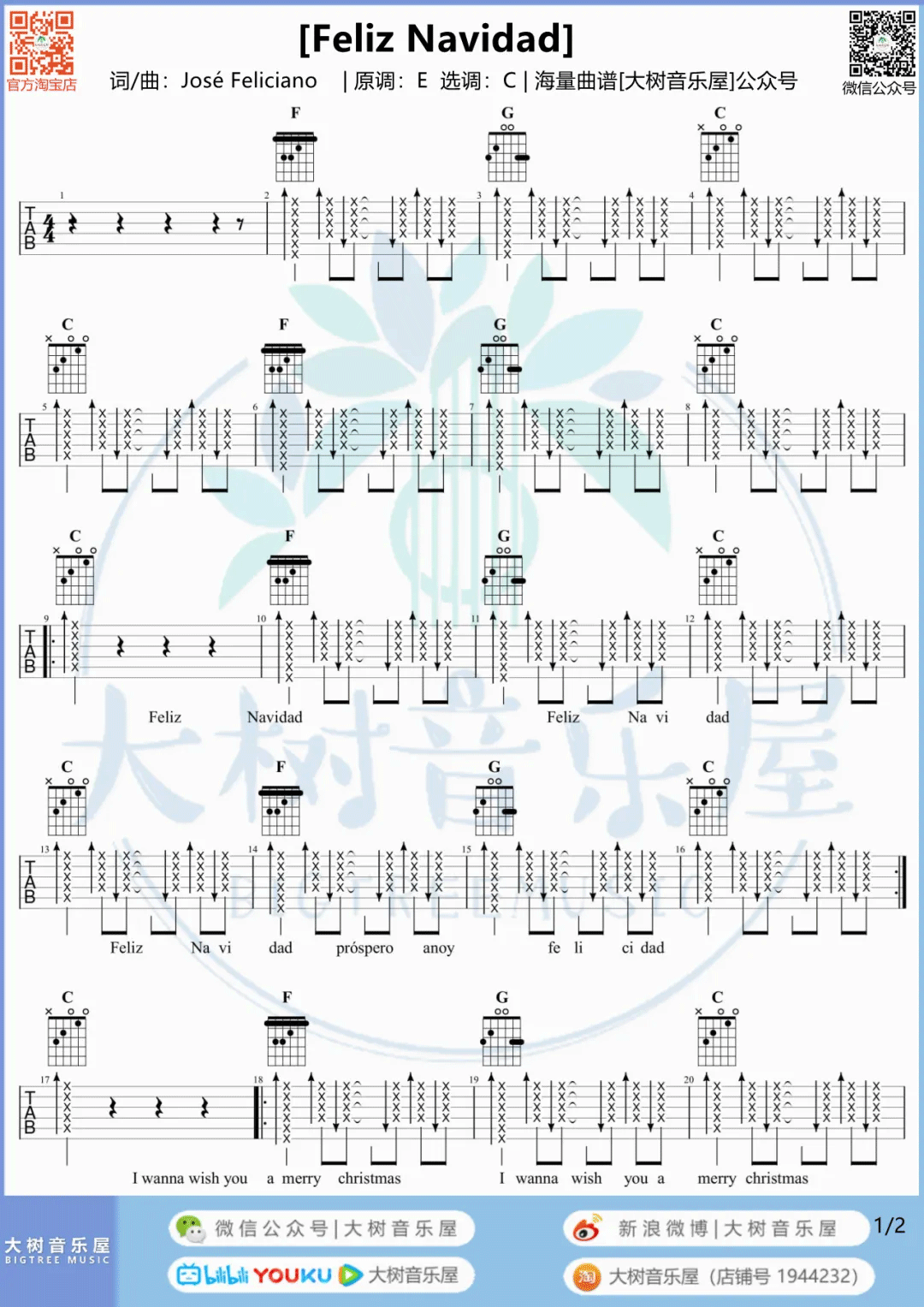 《圣诞歌曲《Feliz Navidad吉他谱》(G调)》内容来自于互联网,不能保证内容的准确性与完整性,仅供学习交流欣赏,请勿用于其它用途,内容版权归原作者及来源网站所有,如有侵犯到您的权益请来信告知,我们将及时删除。