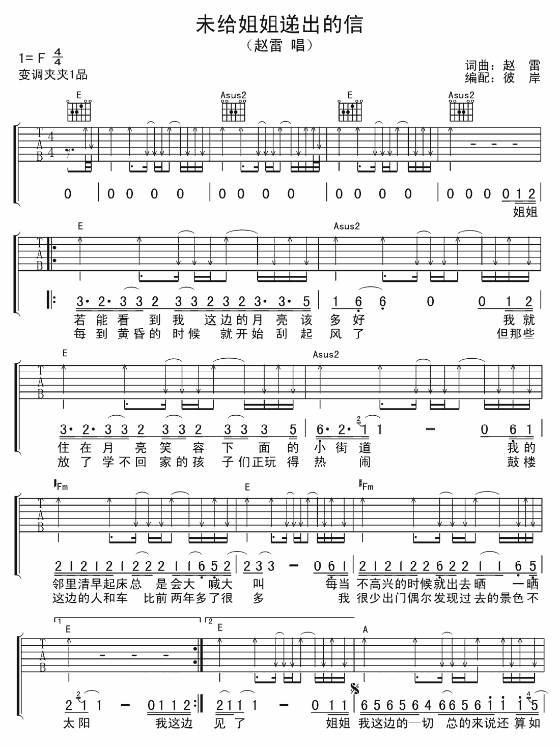 《赵雷《未给姐姐递出的信吉他谱》(C调)》内容来自于互联网,不能保证内容的准确性与完整性,仅供学习交流欣赏,请勿用于其它用途,内容版权归原作者及来源网站所有,如有侵犯到您的权益请来信告知,我们将及时删除。